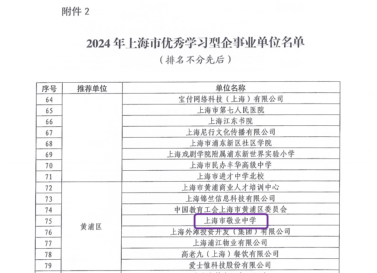 为贯彻落实《上海市终身教育发展“十四五”规划》和《上海市教育委员会等五部门关于进一步推进本市学习型组织建设工作的通知》精神,根据《上海市学习型社会建设与终身教育促进委员会办公室关于开展2024年上海市优秀学习型组织推荐工作的通知》,经过推荐、公示等程序,学校荣获2024年上海市优秀学习型组织称号。