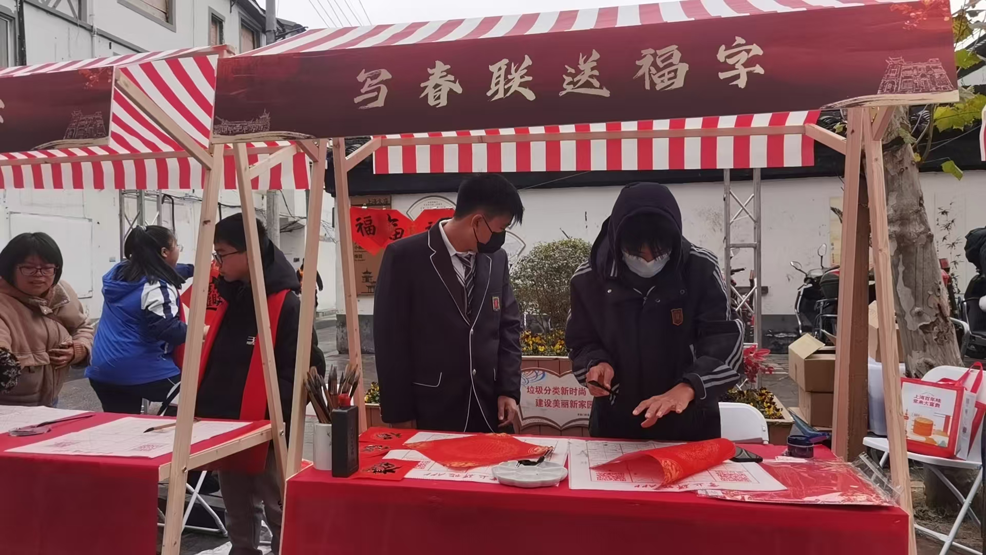 在文艺庆典开始之前,擅长书法的同学们早早来到了被装点一新的文庙路,泼墨落笔写下了一幅幅对联和一张张“福”字,满含对于新春佳节的期待与对新的一年的憧憬,当那些充满感情的字画在前来游览的居民之间传递时,好似传递着最美好的祝福。