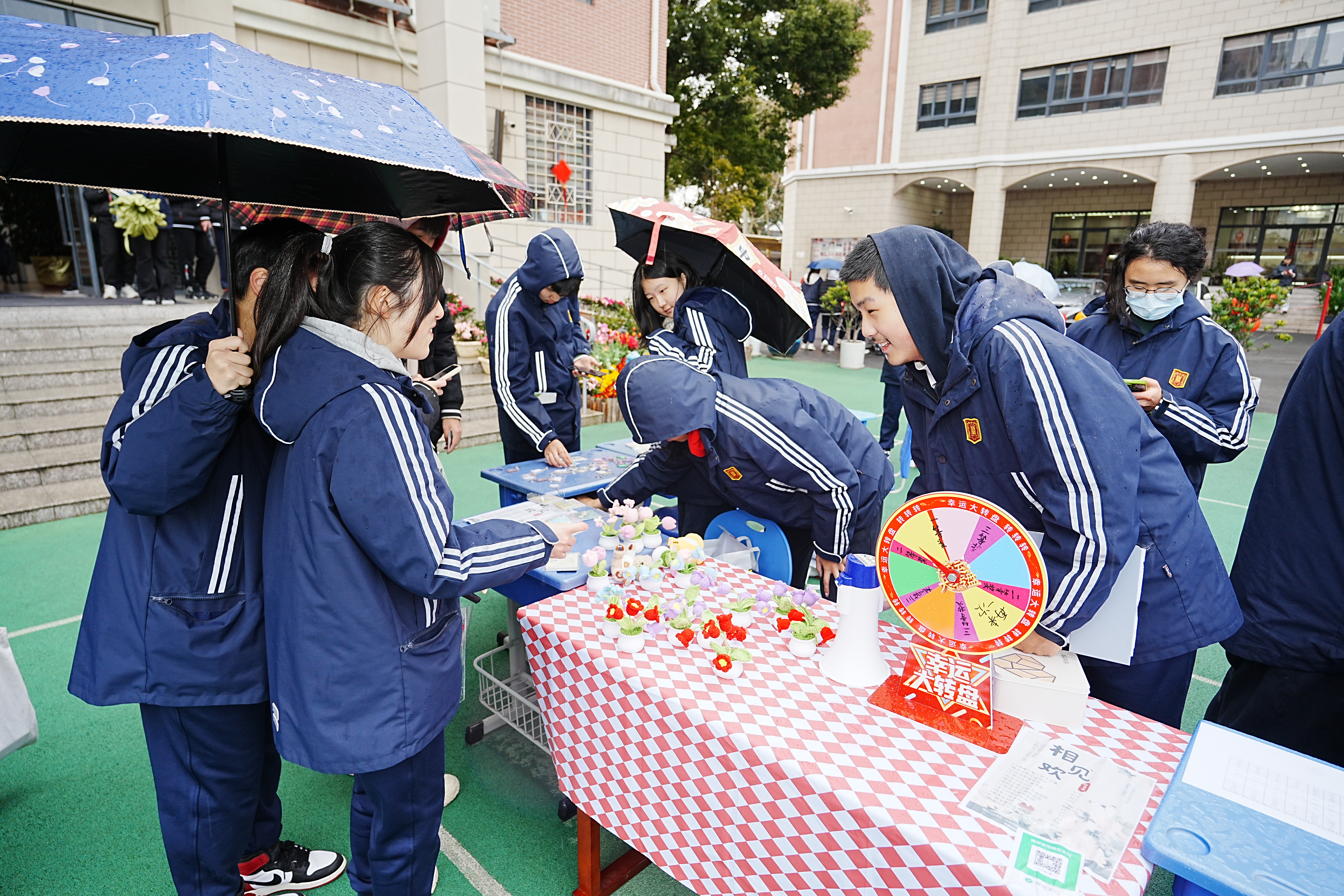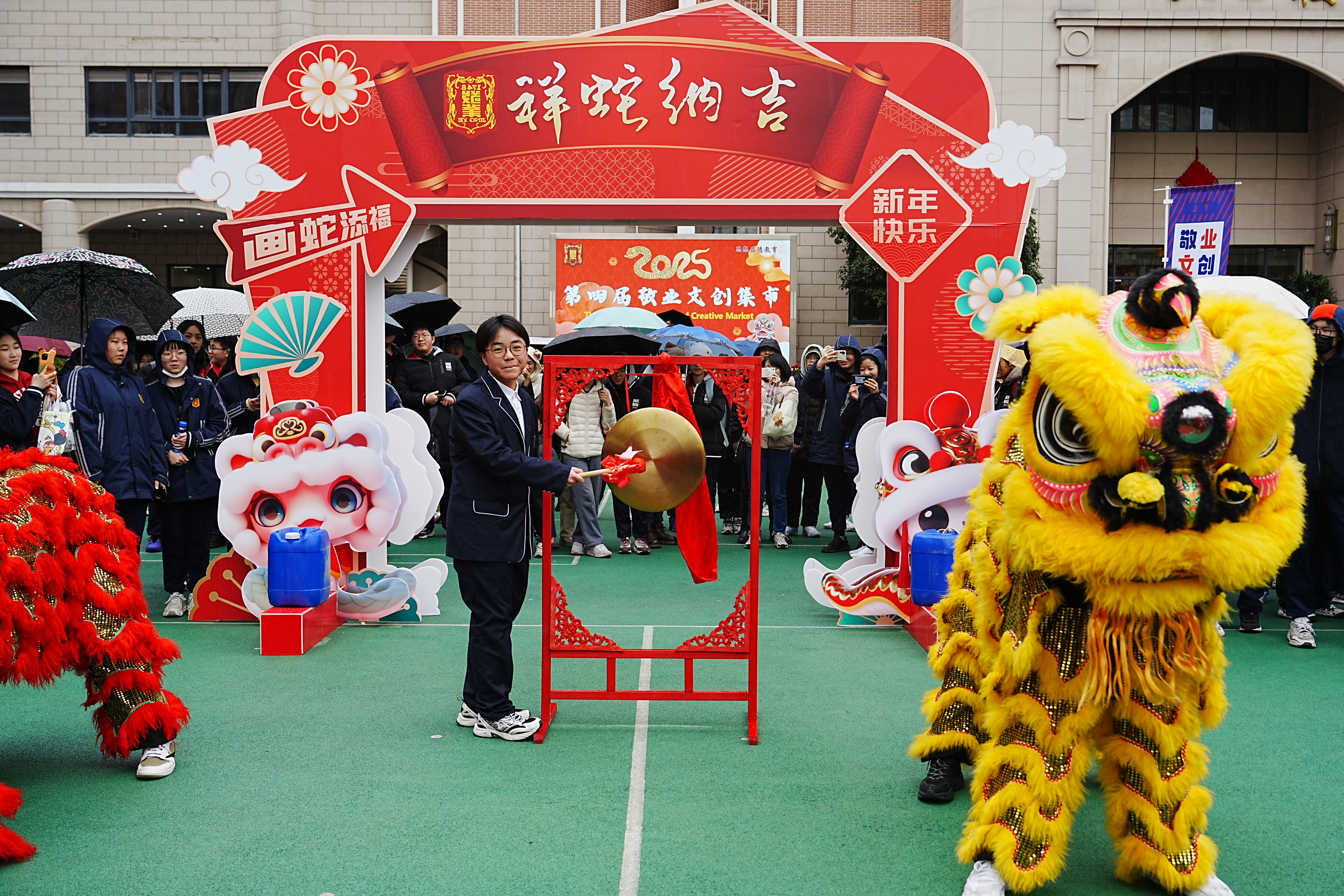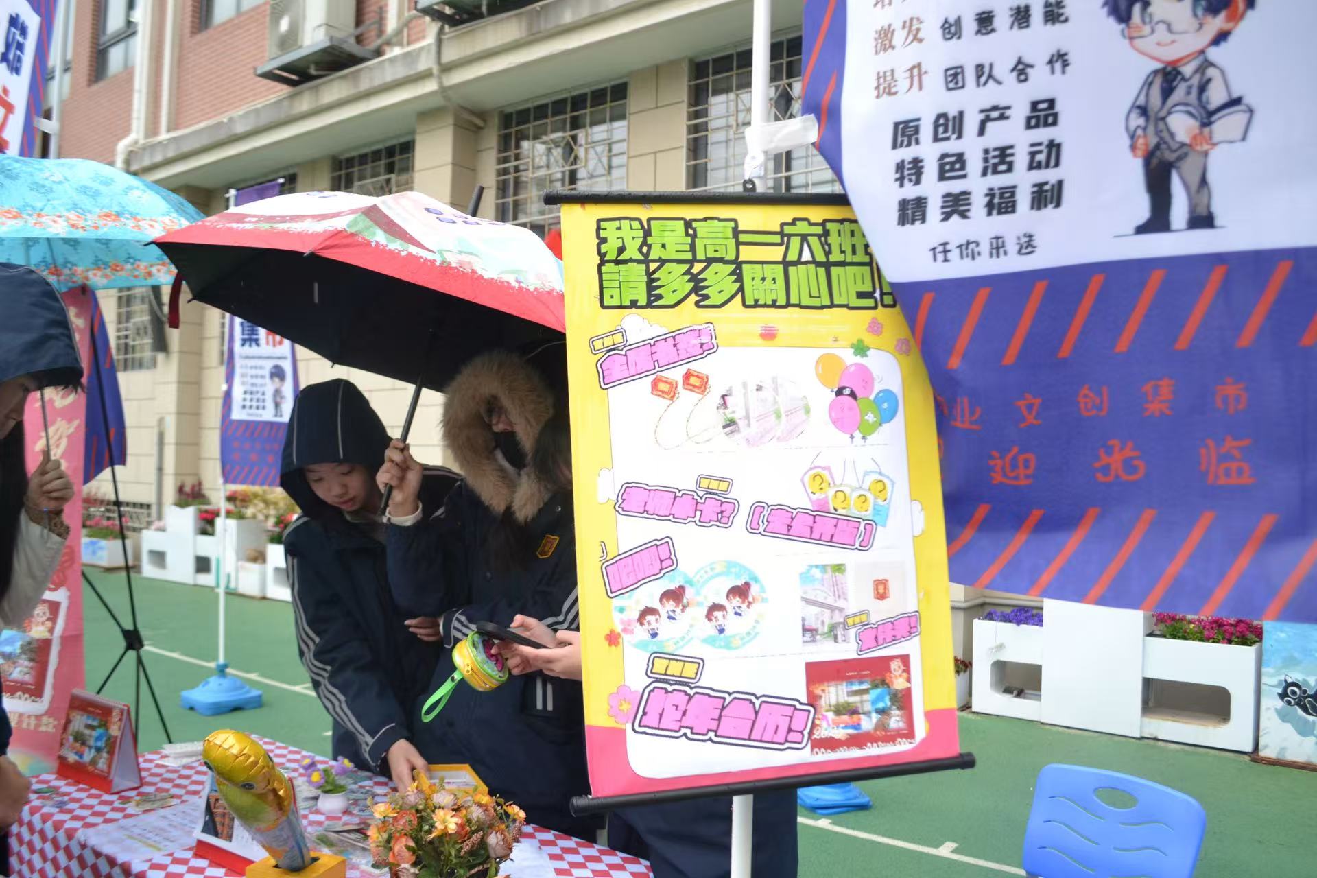 开幕式上,高一3班的费子媛同学面对突如其来的雨水,依然从容不迫地完成了主持任务。随后,在余媛媛老师指导下的啦啦操表演瞬间点燃了现场气氛,赢得了热烈的掌声。紧接着,副校长张丽霞和学生会主席姚妍赉为舞狮点睛,陈思凡老师指导的舞狮表演将舞蹈、武术和音乐融为一体,充分展现了传统文化的活力与魅力。最后,随着第三届敬业文创集市销冠团队的黄琛同学敲响开市锣,集市正式拉开帷幕!
