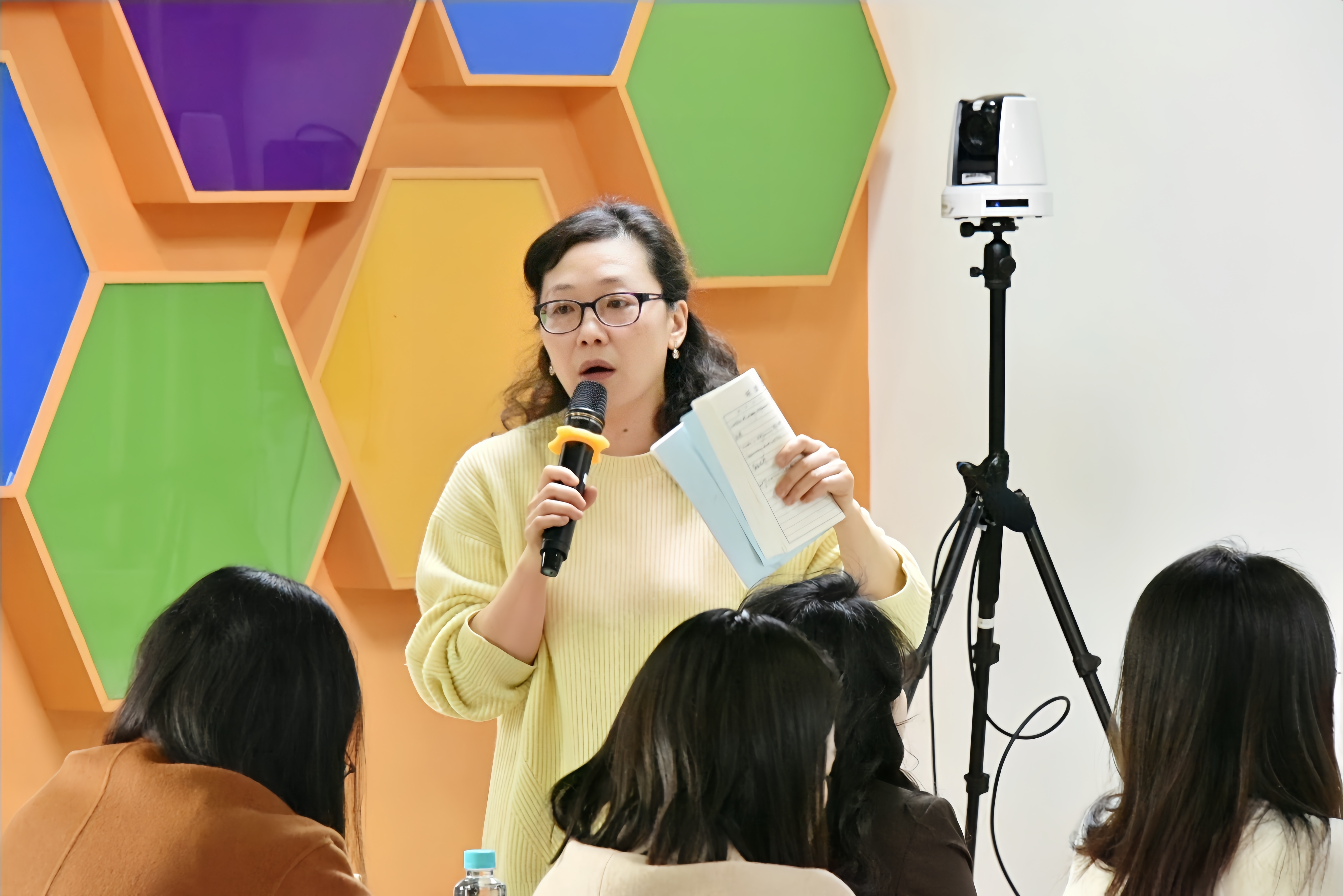课后,金敏老师对朱玲老师的课堂进行了细致点评。她指出,教师应利用作文题目中的关键字倒推维度,帮助学生更好地理解题目;同时,教师应引导学生从所给信息中进行思维拓展,并提供脚手架,让学生有方向地写作。金敏老师同时建议可以给予学生更多自由发挥的空间,板书应体现学生的多样答案,最后的总结也可让学生来完成。