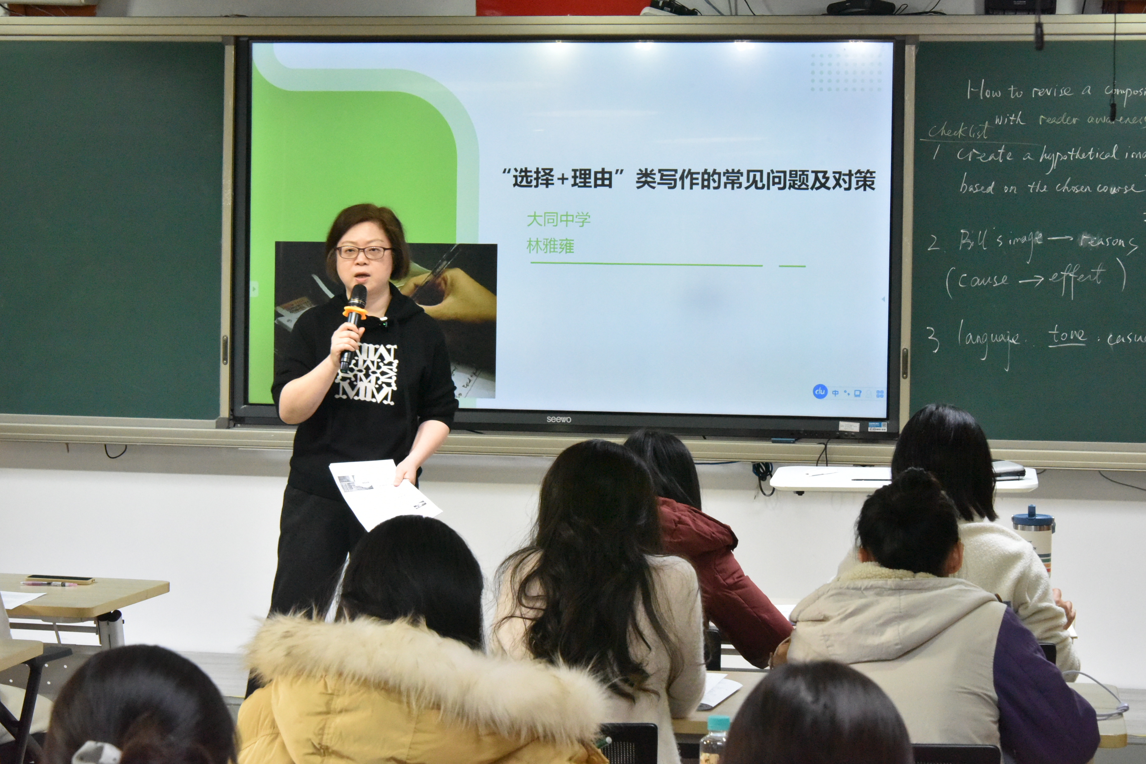 随后,大同中学林雅雍老师以22年秋考真题为例,分享了“选择理由”类写作教学的常见问题及对策。林老师首先展示了教学思维路径的审题和头脑风暴第一稿,随后通过分析两篇学生习作,总结出选项特色分界不明、说理笼统抽象、逻辑链不完整等共性问题。针对这些问题,林老师提出了头脑风暴修改稿的教学策略,并强调在写作过程中生成语言检查清单的重要性。此外,她还就如何利用ai技术提升写作教学提供了建议,为教师们打开了新的教学思路。