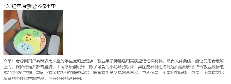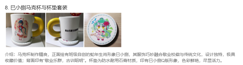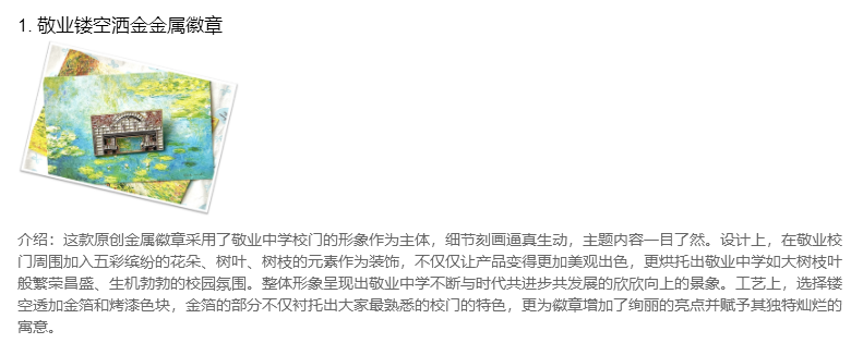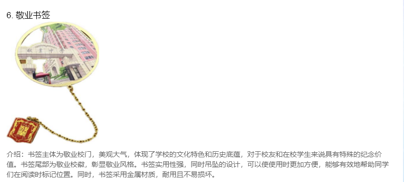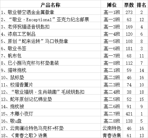 本届集市,学校还收到了来自个展位提交的一份最具代表性的文创纪念产品,并在师生间进行了广泛的投票活动,本次评选共计1340人次参与投票,最后高二7班的木雕小夜灯、高一1班的1、敬业镂空洒金金属徽章,以及高一6班的敬业书签,分获前三甲。我们满怀期待,希望在2026年的第五届敬业文创集市上能见证更多创意满满、有着敬业特质和深厚传统元素的文创产品,透过一届又一届的文创集市,我们似乎从中看到了jyers“日新又新”的独有敬业风貌。