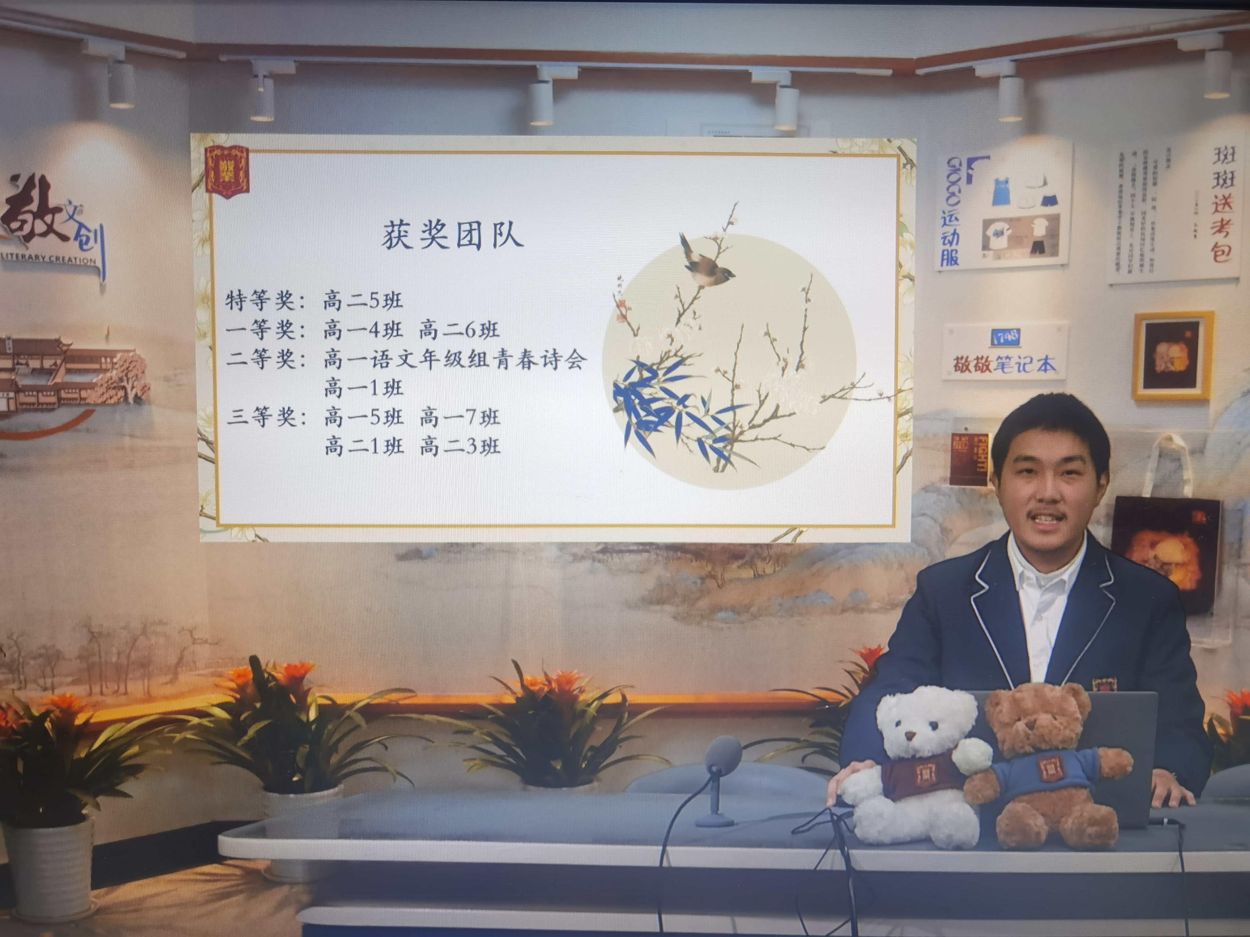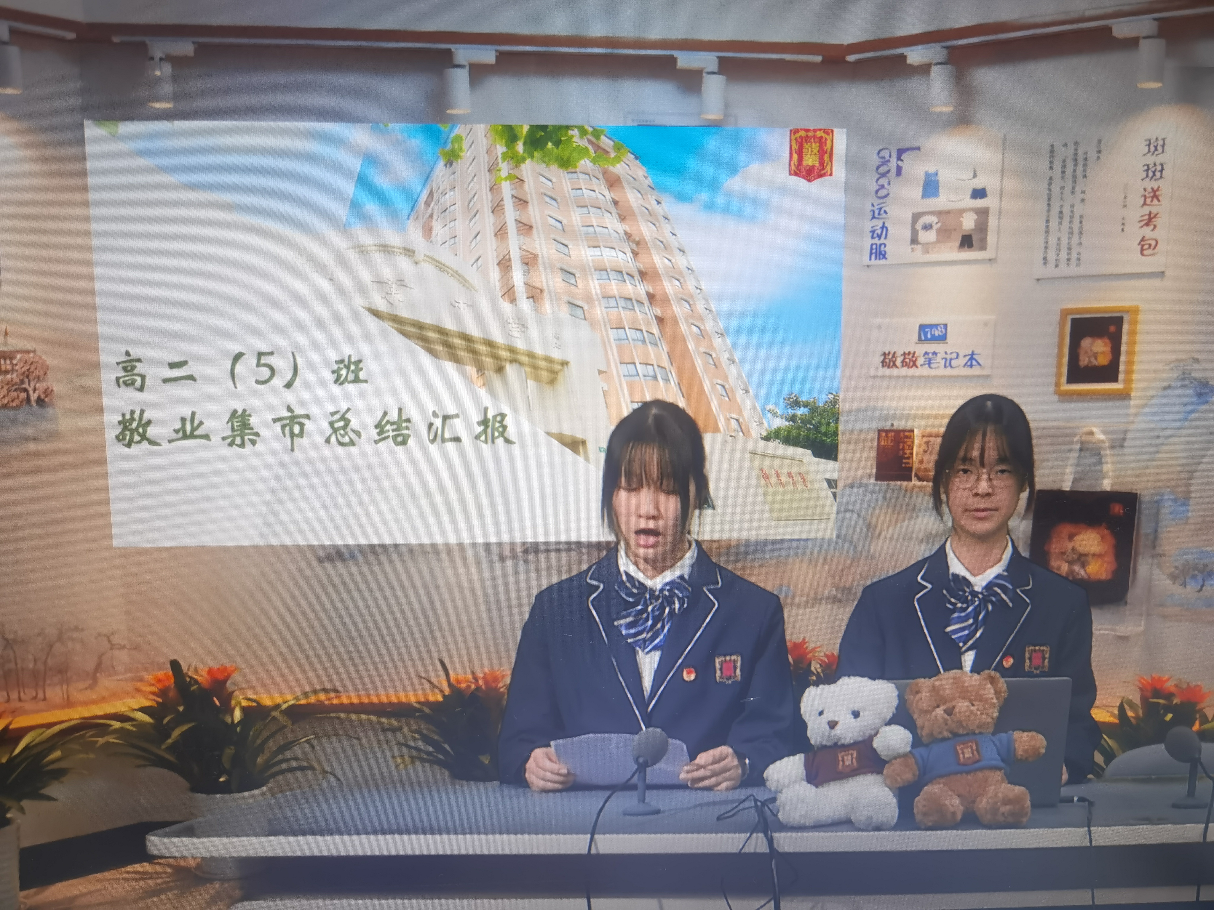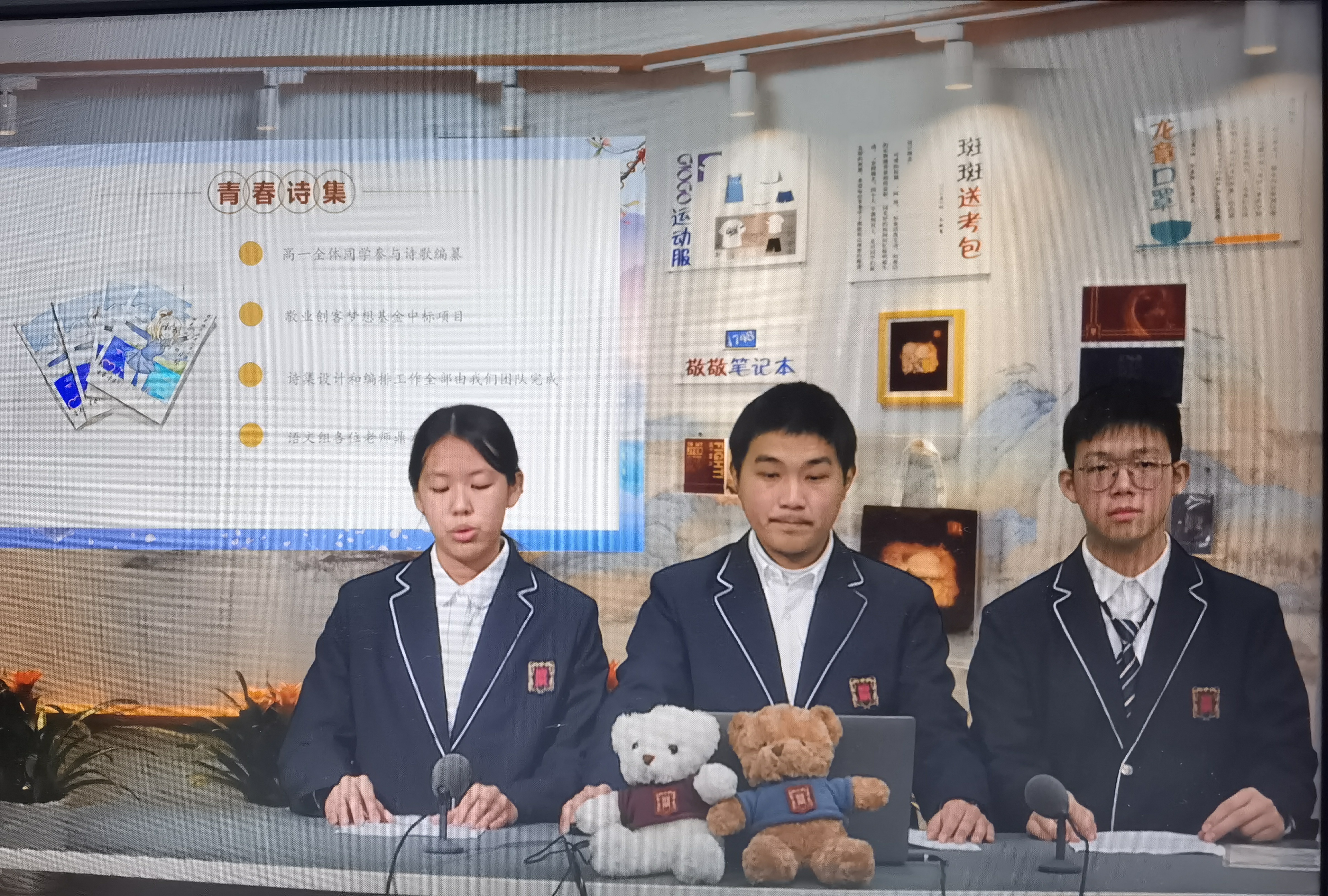 2月28日校会课,第四届敬业集市总结大会如期举行。本次校会课,由高一4班的周天昊同学主持,并邀请到了四组获奖团队参与分享。他们分别是:高一语文年级组《青春诗集》签售会、高一1班、高一4班和高二5班。各优秀团队代表分享了筹备过程,交流了文创产品的设计理念,并通过ppt的形式,向老师和校友展示了旗下文创产品。部分摊位的商品更是让人眼前一亮:敬业小熊、二次元立牌、非遗漆扇、奶龙挂件、《青春之歌》诗集……每一件作品都蕴含着同学们对传统文化的热爱与创新,让师生们在熟悉中寻得惊喜,流连忘返。