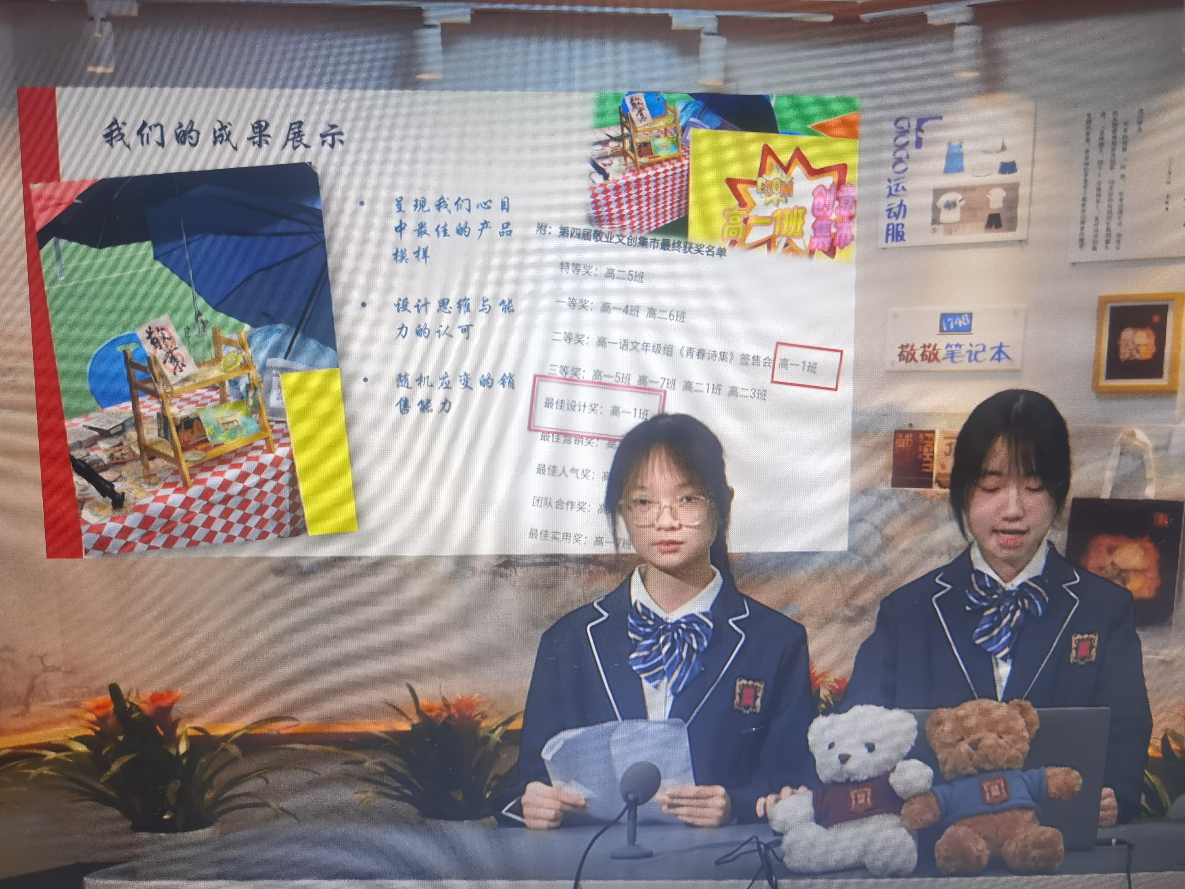 其中,本次集市销冠,兼一等奖获得者高一4班的分享会尤为精彩。曹嘉睿、李秋伊、徐之雯三位同学作为代表参与发言。他们团队通过重构日常生活的意义感,让非遗成为年轻人表达态度的“新潮品”而非“老古董”;用实体产品激活校园文化传播链;坚持以在地化设计打破ip周边同质化僵局的商业理念,瞬间吸引了全校师生的目光。会后,来自高一4班的代表李秋伊同学表示:“作为一名刚入学的高一新生,这是我第一次正式体验校园新闻直播。我们介绍了班级集市的产品和设计理念以及活动的收获。虽然在直播的过程中难免会遇到意外,但是这次经历对我而言是一次提升自我能力的机会。这不仅帮助我提高了语言表达能力,逻辑思维能力以及应对突发状况的能力,更让我对市场营销和团队合作有了充分的理解。这次既紧张又兴奋的体验带给我的,不仅是专注力和责任感的提升,更多的是对自我的肯定与满足感。相信在明年的敬业集市,我们班级一定能够再创佳绩。”