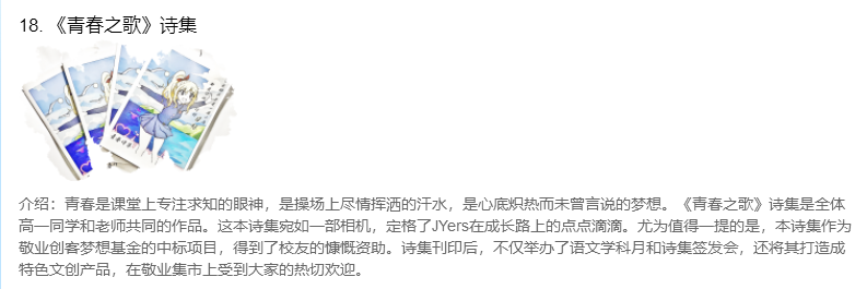 本次集市二等奖获得者——高一语文年级组《青春诗集》签售会,作为第一个分享的团队,也是我校自举办敬业集市以来第一个获奖的特色摊位,瞬间吸引了同学们的目光。他们团队提出了“以诗集为相机,定格东方文化之美”的广告语,让传统与创新交融,激情与厚重碰撞。在此基础上,他们精心打造了“相见欢杂货铺”这一特别的摊位。“相见欢”,饱含着敬业学子们美好的期许,希望每一位同学都能在此觅得心仪的文创好物,沉浸于东方文化的独特魅力之中,既能手持烟火以某生,又能心怀诗意以谋爱。