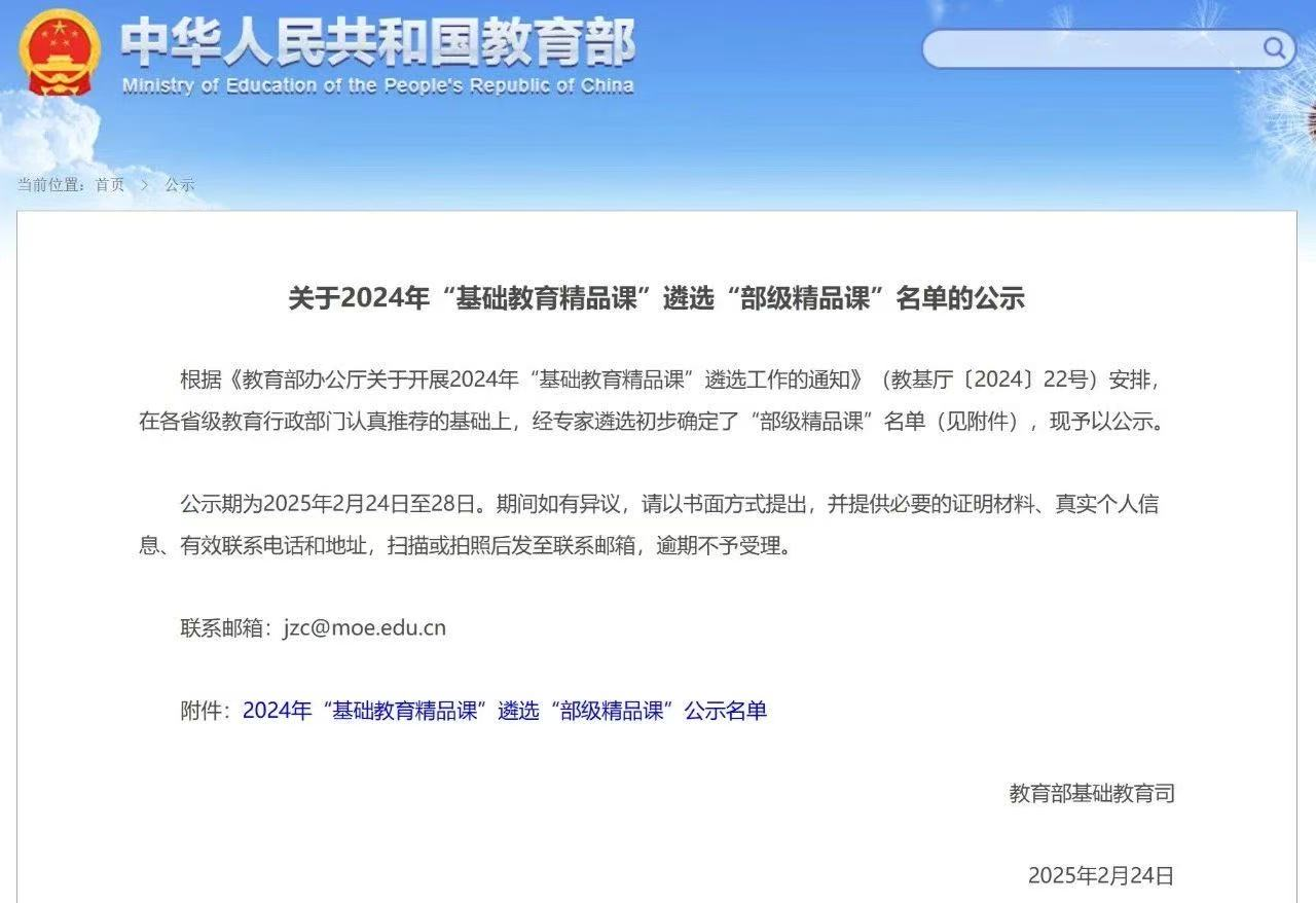 根据《教育部办公厅关于开展2024年“基础教育精品课”遴选工作的通知》(教基厅〔2024〕22号)安排,在各省级教育行政部门认真推荐的基础上,经专家遴选初步确定了“部级精品课”名单。