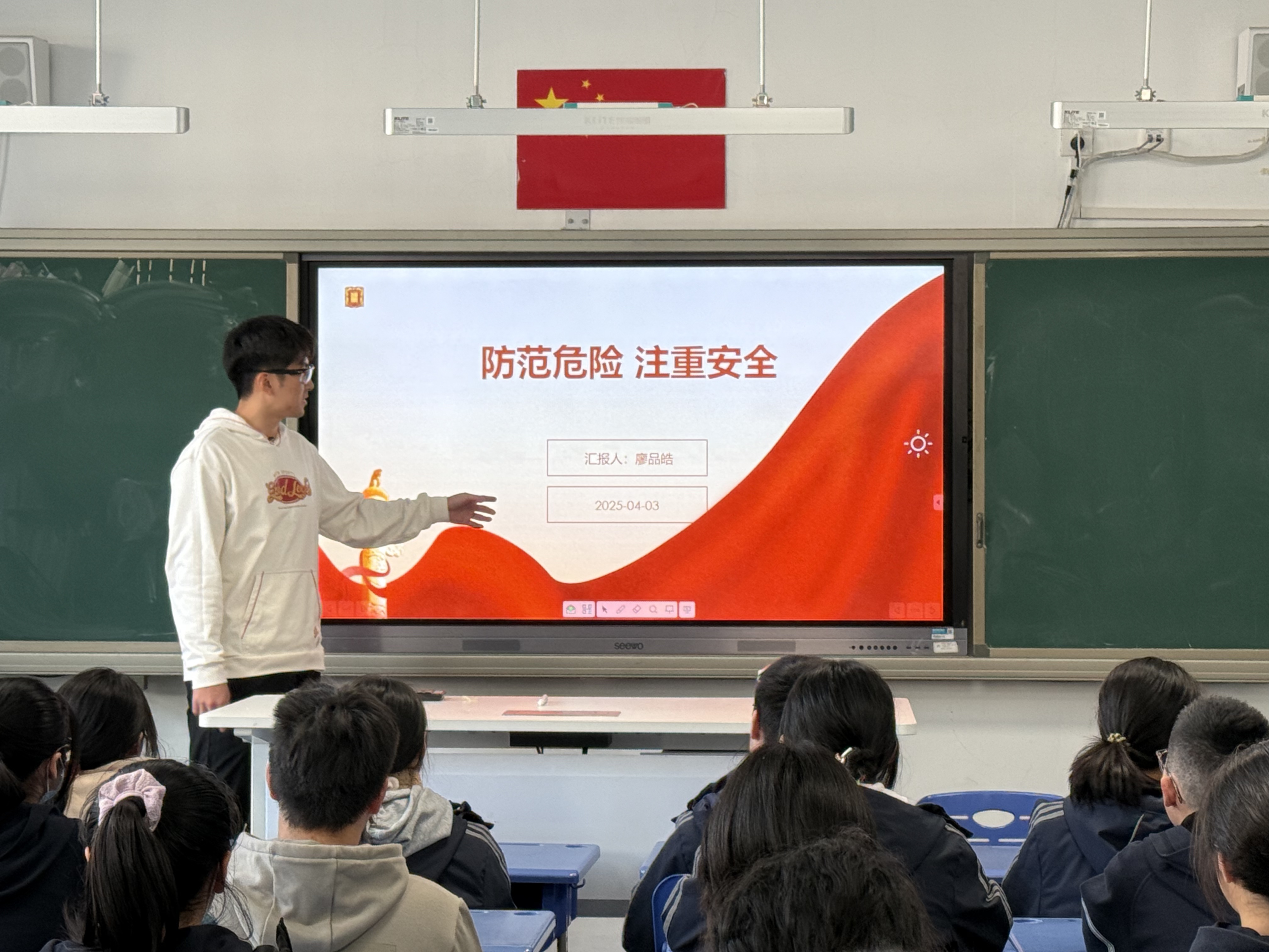 在安全教育周期间,担任未成年人保护工作的廖品皓老师给高一同学开展了一堂主题为《防范危险注重安全》的教育课。本堂课以同学们高二研学前往绍兴研学为实例,分段式地向同学们阐述了无论在何种领域,安全的核心目标始终是降低风险,以保障稳定与健康这一关键要素。在课堂中,首先是出行安全,廖老师提示同学们在日常上学的过程中严防“鬼”探头和“开门杀”,加强安全意识的建设,并通过防御性驾驶的方法,引入情境教学帮助同学们更好地防范在出行过程中遇到的风险。随后廖老师讲解了轨道交通、公共交通和非机动车上学的注意事项,为同学们建立了出行的安全意识。
