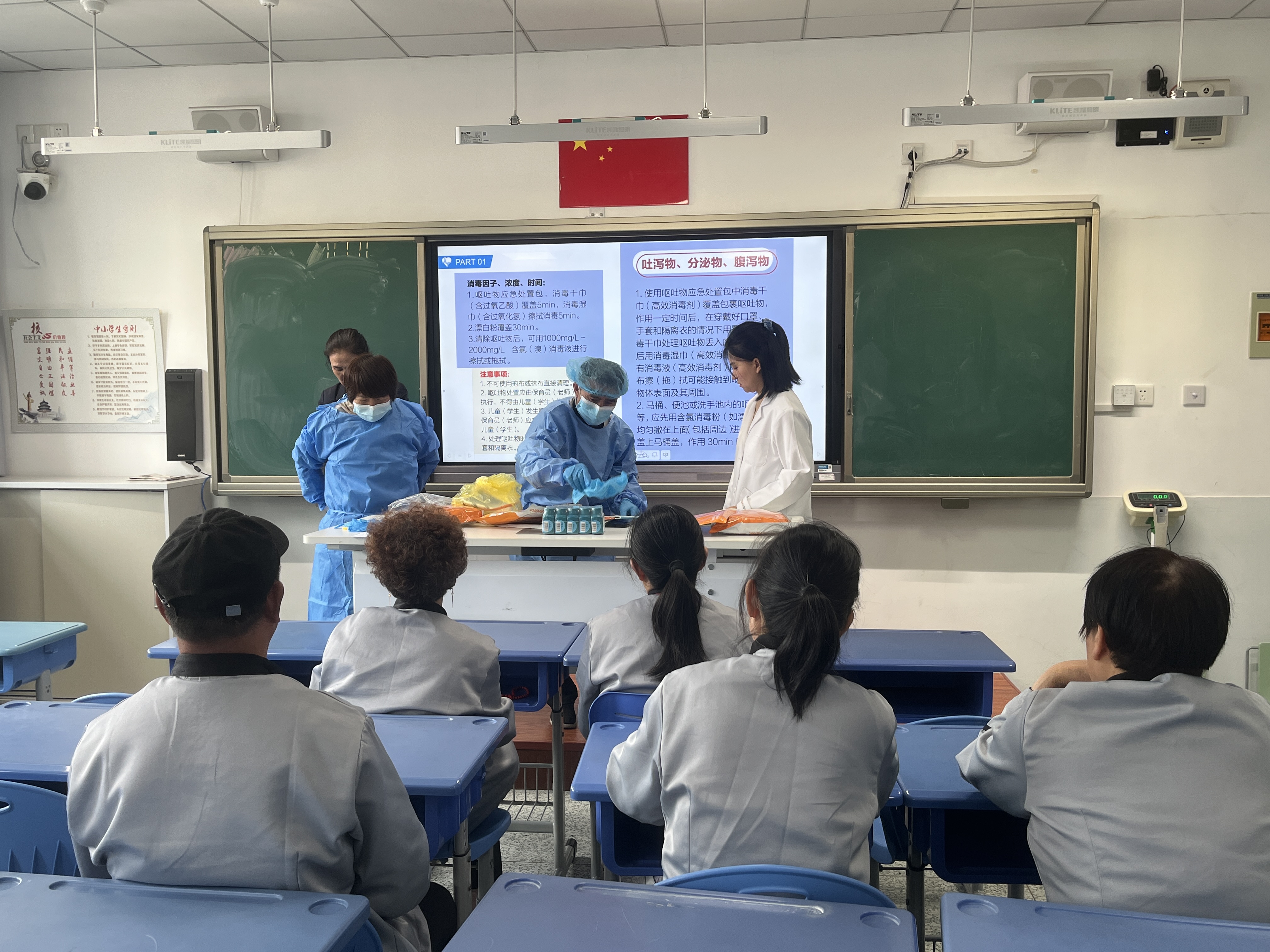 为全面落实规范消毒工作,切实提升消毒人员的业务水平,4月7日下午,校保健室开展了消毒人员操作培训,全体参加了培训。在现场培训会上,学校卫生保健员以图、文、视频、演示的方式就预防性消毒、终末消毒的基本概念、消毒剂配置、消毒剂施药方法、消毒方式、常见污染对象的消毒方法等进行了详细讲解,就穿脱防护用品注意事项及基本流程等进行了细致阐述,现场消杀人员进行了呕吐物清理消毒演练。