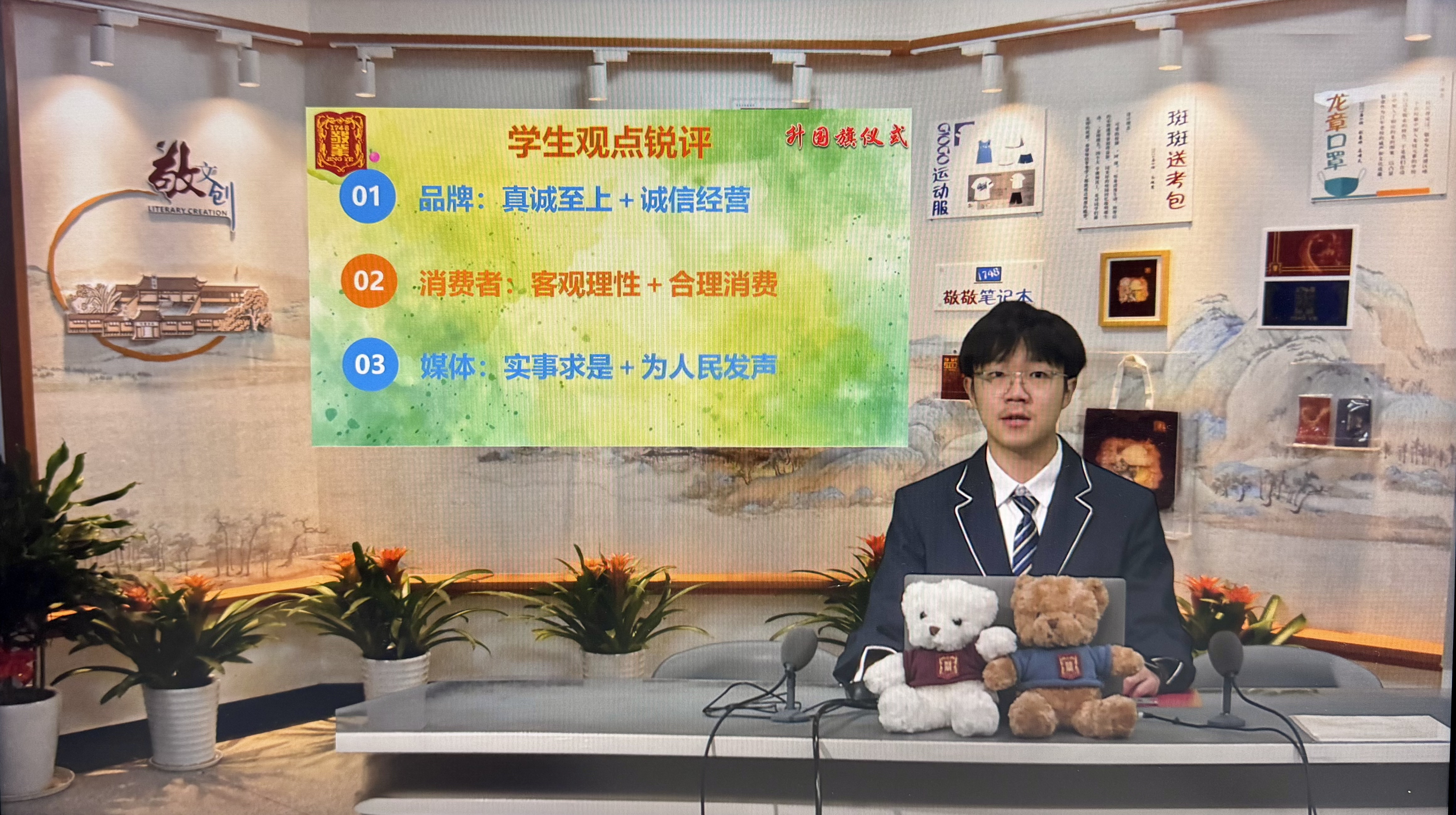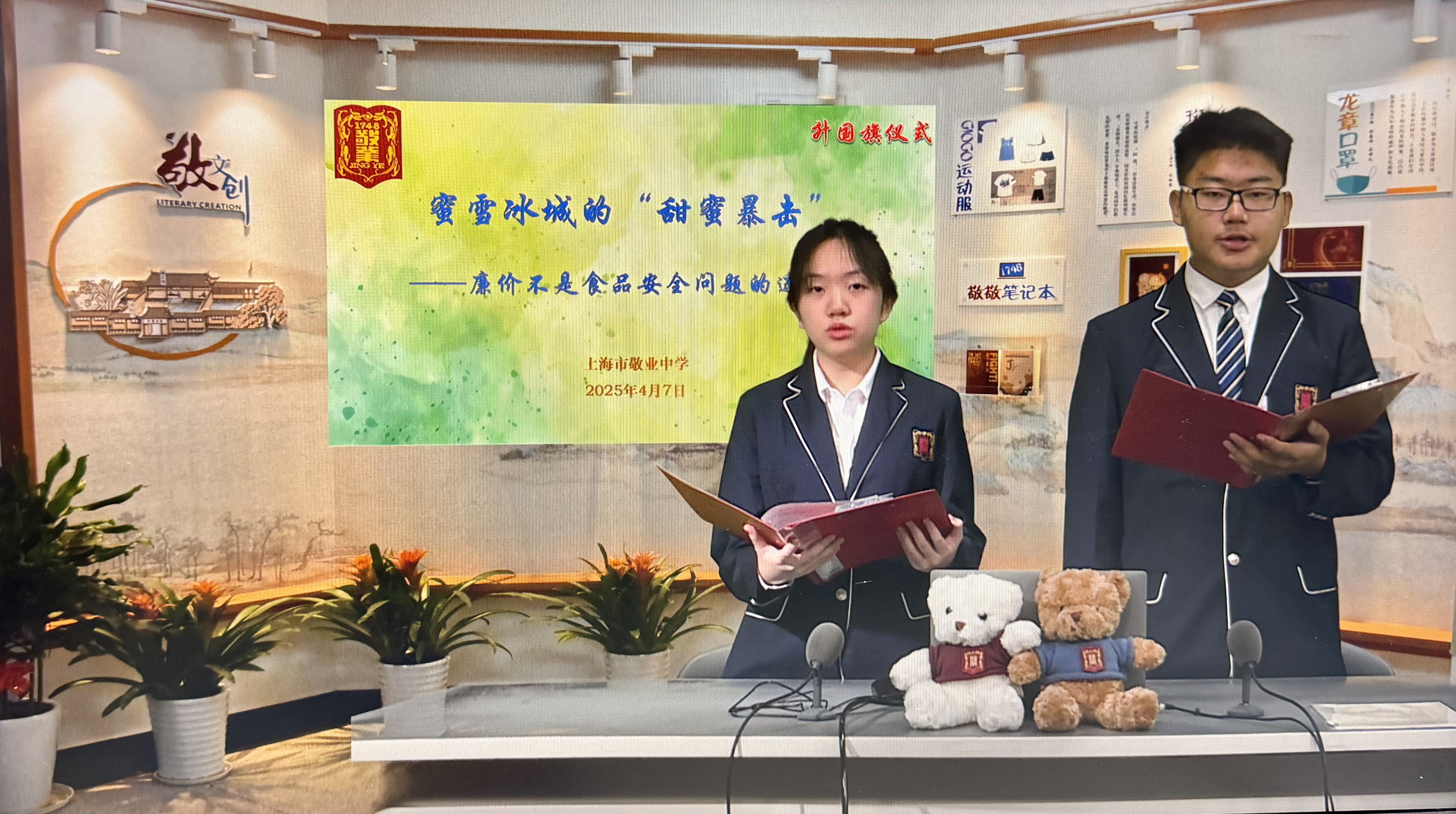 4.7上午,我校举行“蜜雪冰城的‘甜蜜暴击’——廉价不是食品安全问题的遮羞布”主题锐评,以评论新闻热点的形式培养学生的媒介素养。本次主题锐评聚焦“蜜雪冰城315隔夜柠檬片”事件,由高一6班的章嘉予与高一7班的罗念成同学主持。