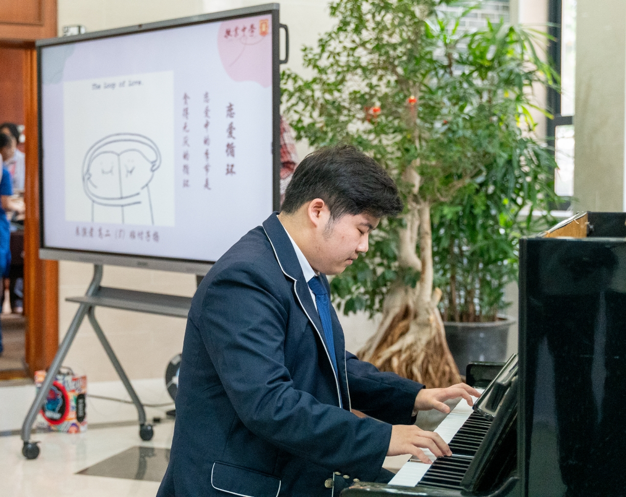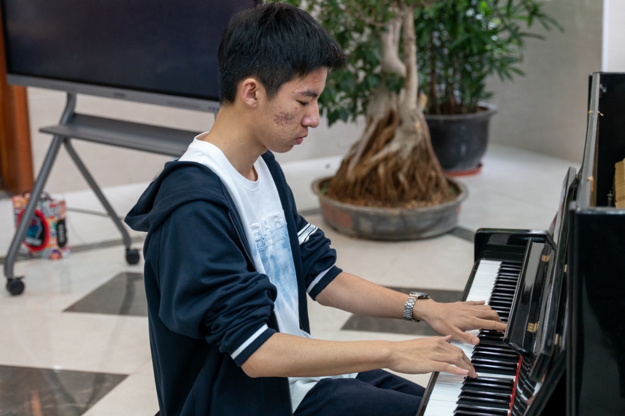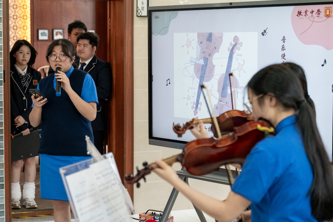 本次活动得到了高一和高二喜爱艺术音乐的老师和同学们的关注。2026届5班张奕轩同学担任了活动的主持工作,在2026届8班付子扬同学的暖场钢琴声中活动缓缓开幕。2026届7班乐泽宇同学带来了钢琴独奏《你的名字》,用轻柔的旋律流淌着对三叶与泷的思念;2026届2班赵雅萱同学带来歌曲《bb88》,致敬歌手方大同;2026届8班付子扬用钢琴响起了《恋爱循环》甜蜜的旋律,让心跳与音符跃动;来自香港圣士提反女子中学的三位同学带来小提琴二重奏与演唱《千与千寻》,熟悉的旋律让同学们都沉浸在悠扬的琴声之中;最后,2026届1班刘宇轩、陈胄宇、许子翱带来《富士山下》《朋友》《海阔天空》三首粤语歌曲串烧,引发全场充满共鸣的大合唱。