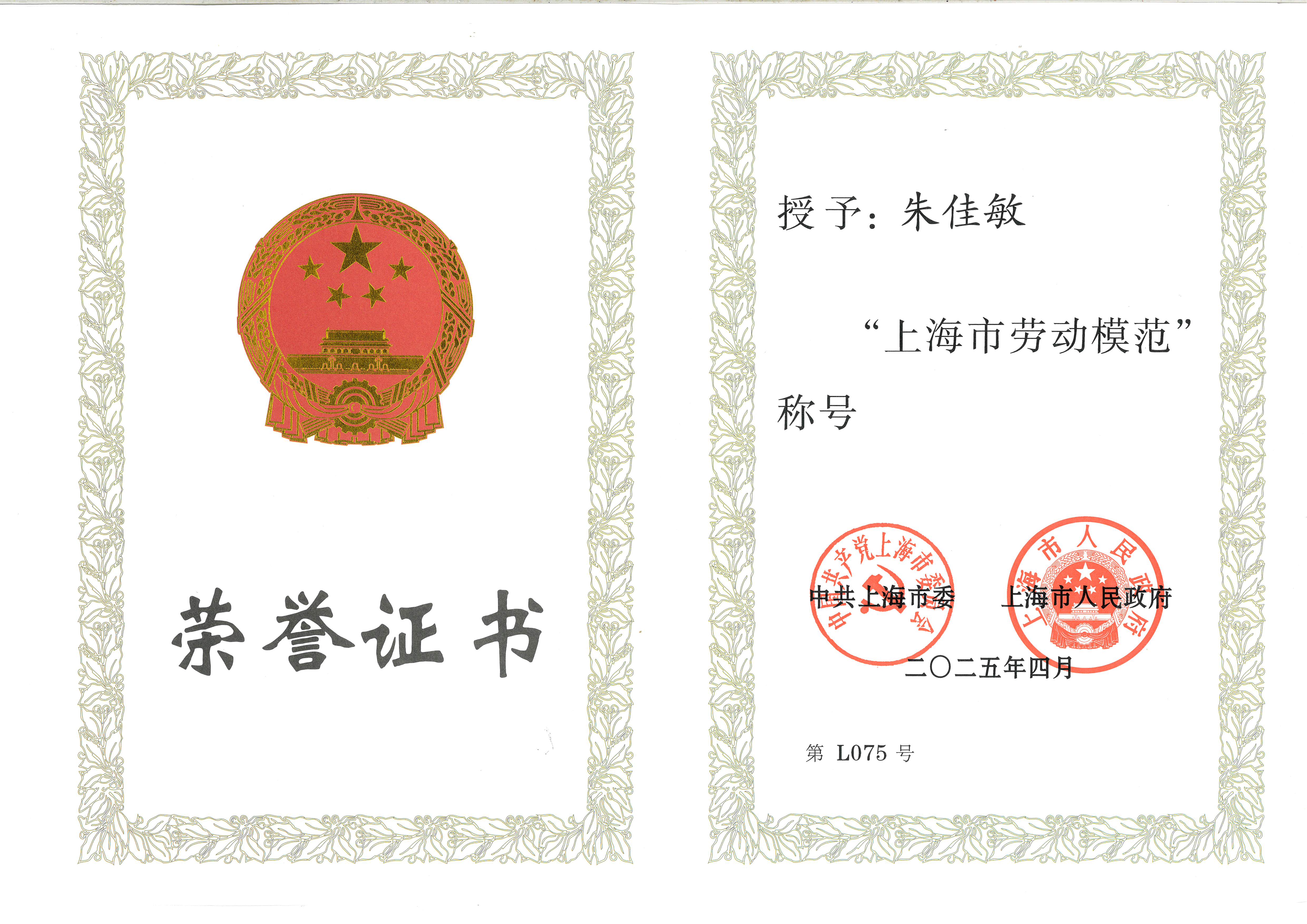 科学副校长、2007届校友朱佳敏获上海市劳动模范荣誉称号