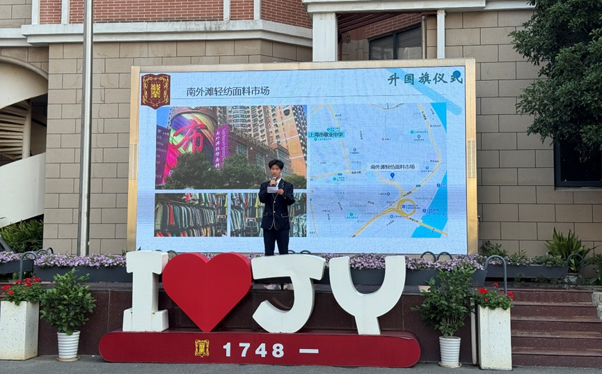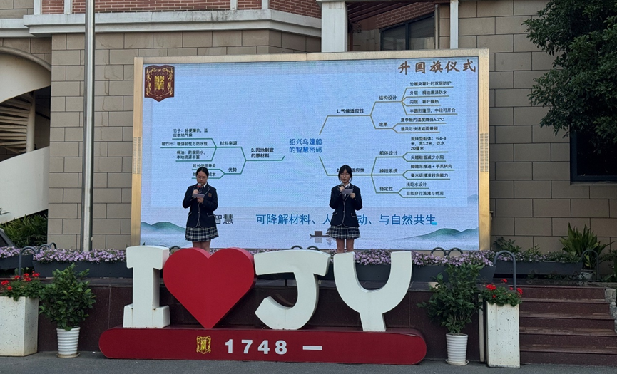 在升旗仪式上,邓克捷同学结合自己在绍兴柯桥滨海工业区的实地参观以及课余时间的深入调查,向大家详细介绍了绍兴纺织业的发展现状及其与上海的历史渊源。贾珮悦和王馨恬同学则聚焦于绍兴臭豆腐的独特风味,深入探究了气候、地形、水文、土壤、生物等各地理要素是如何相互作用,共同塑造了这一地方特色美食。林家宜、全悠、何紫悦三位同学则将目光投向了绍兴乌篷船,他们研究了船篷设计、船体样式如何巧妙应对绍兴的气候和河道特点,并揭示了乌篷船制作中蕴含的生态智慧。此外,郝新仪老师也为大家介绍了绍兴台门建筑如何与地理环境完美融合,展现了传统建筑与自然环境的和谐共生。