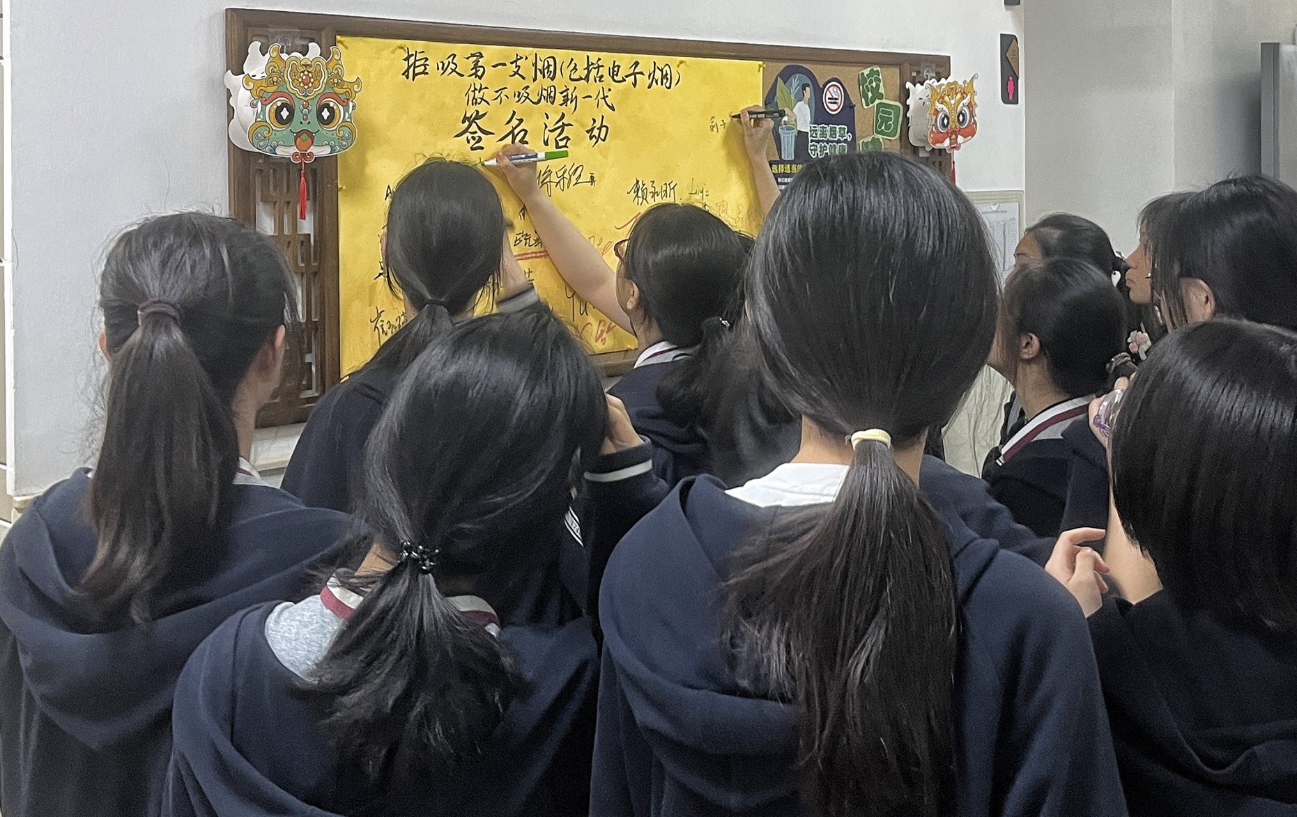 同学们在了解后,踊跃在“拒吸第一支烟(包括电子烟) 做不吸烟新一代”签名墙上签下自己的名字,并表示将远离传统烟草和电子烟,践行健康生活方式,珍爱生命。