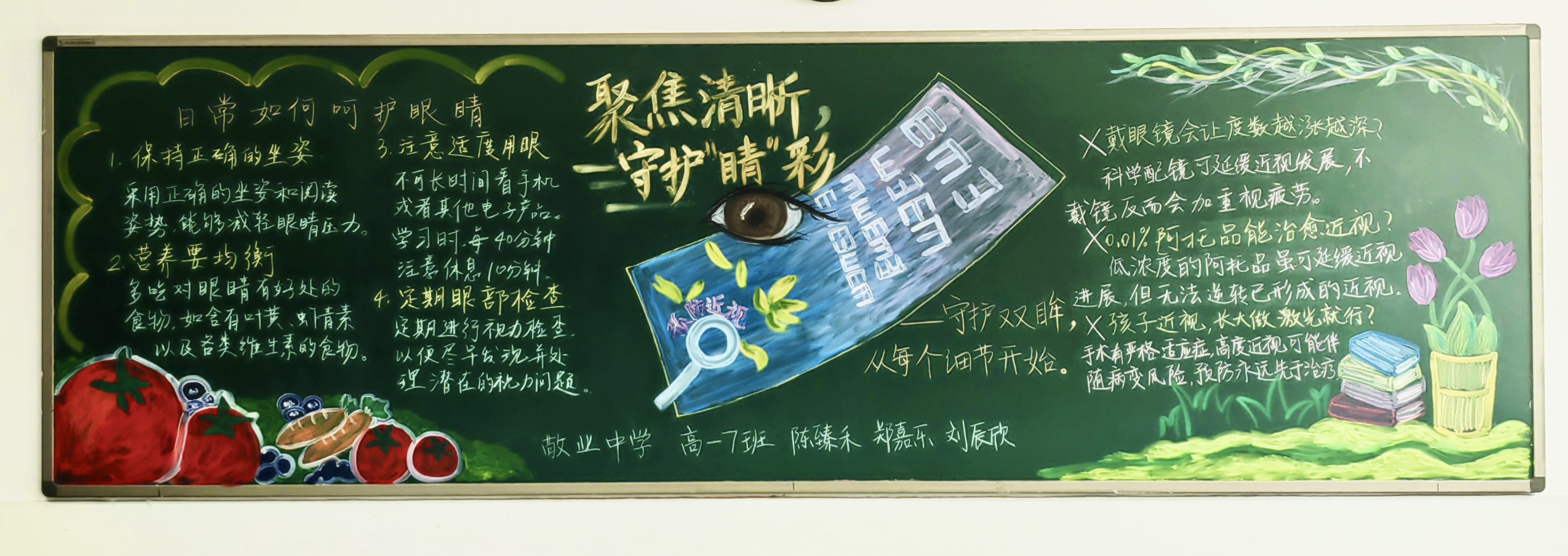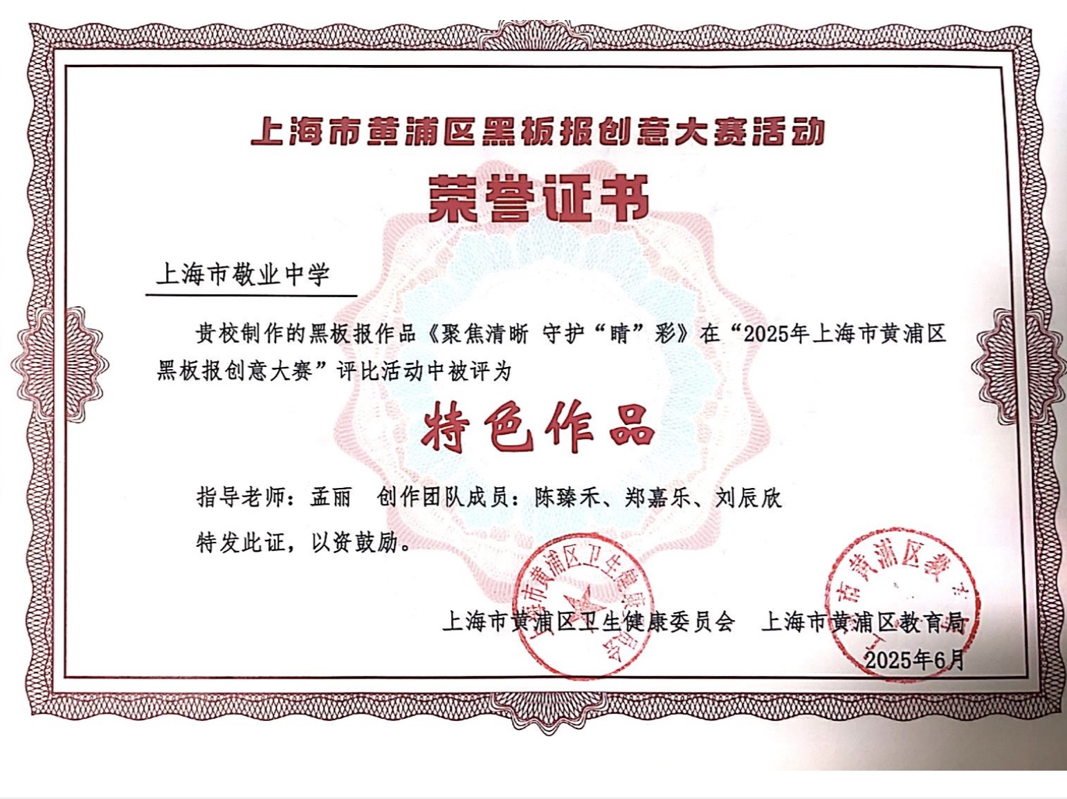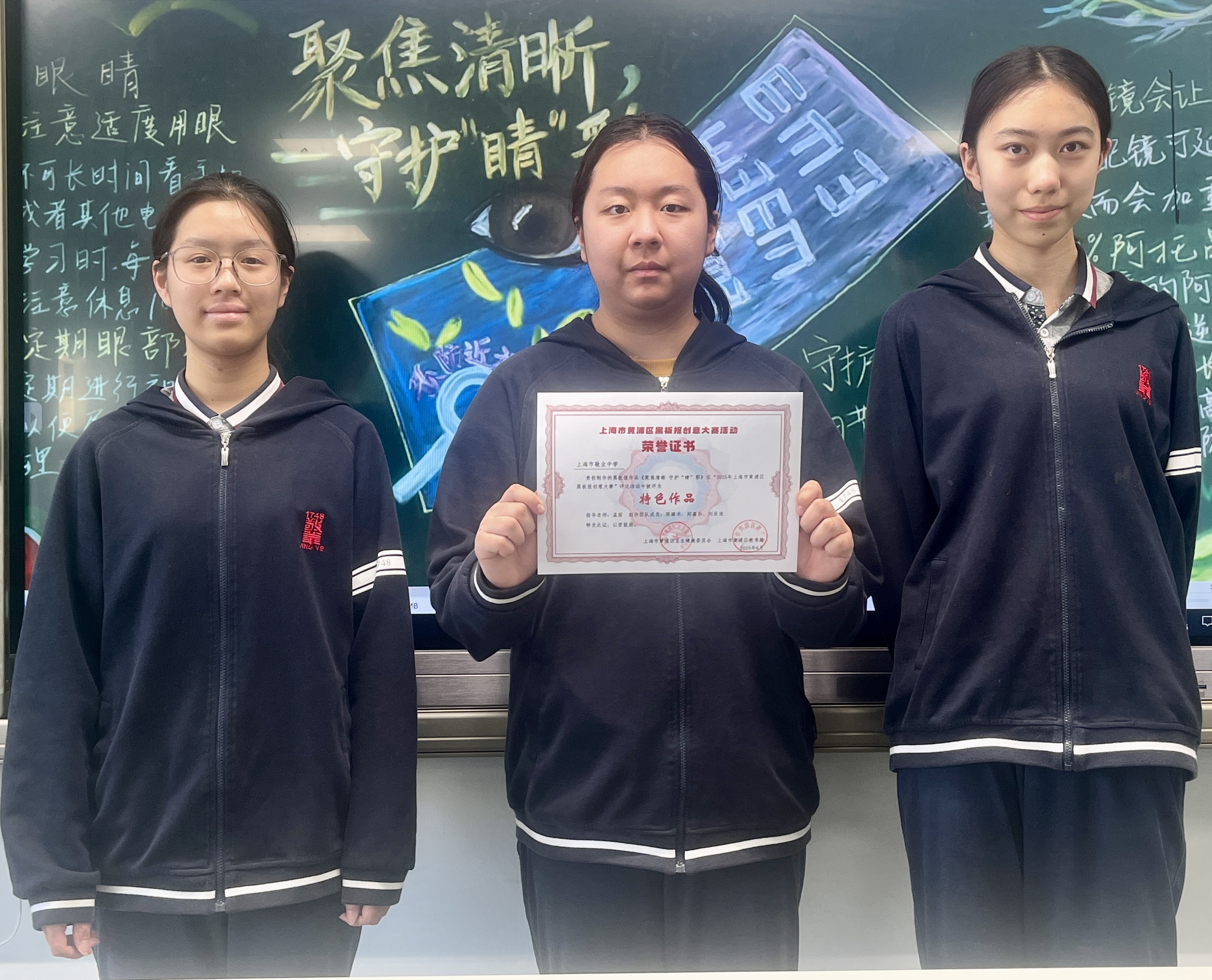 近日,在由黄浦区卫生健康委员会、黄浦区教育局主办,黄浦区疾病预防控制中心(黄浦区卫生健康监督所)承办的“2025年黄浦区中小学生黑板报评比”活动中,我校高一商科班陈臻禾、郑嘉乐、刘辰欣3位同学创作的黑板报作品《聚焦清晰 守护“睛”彩》,经评审,荣获了区级“特色作品”的荣耀称号!