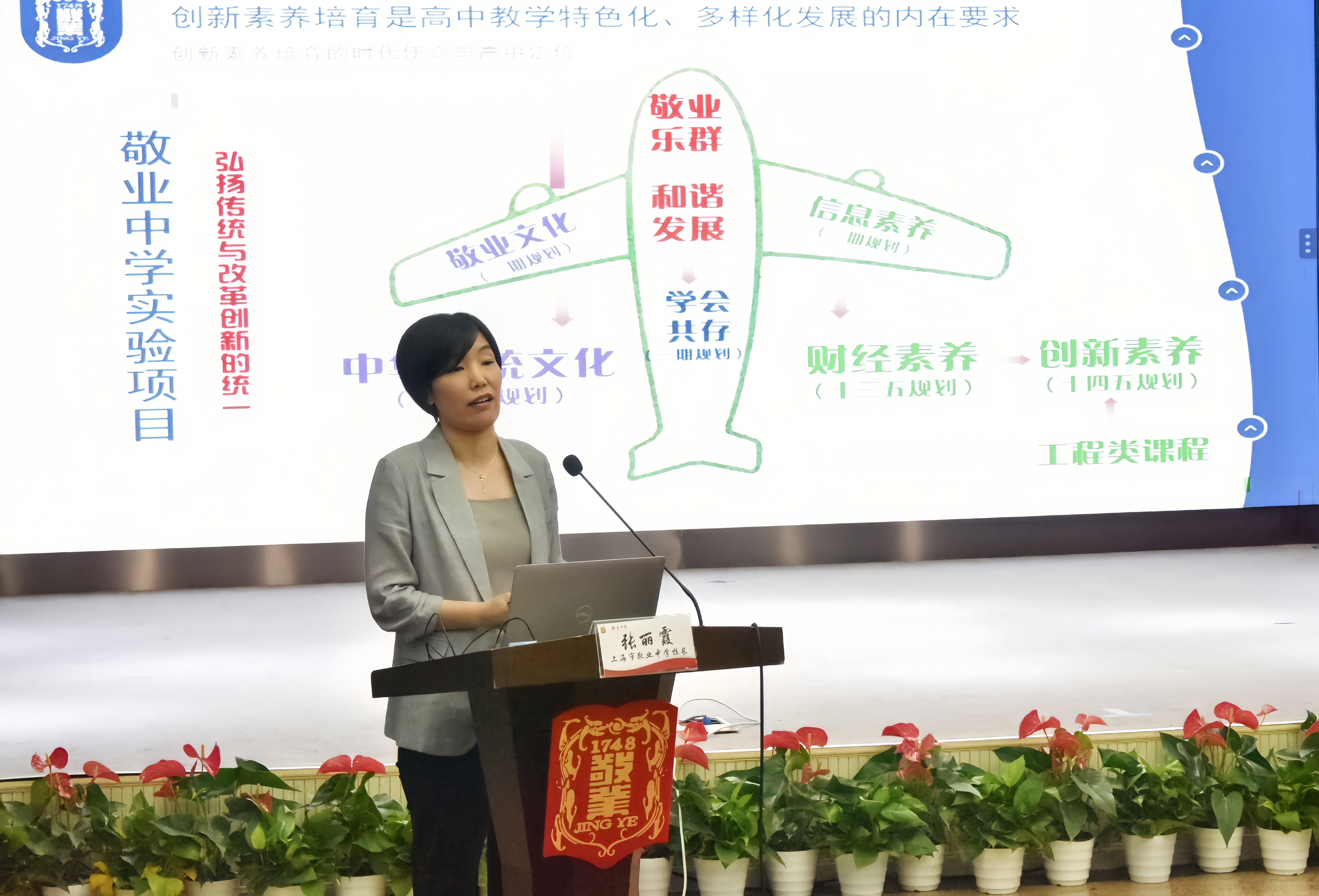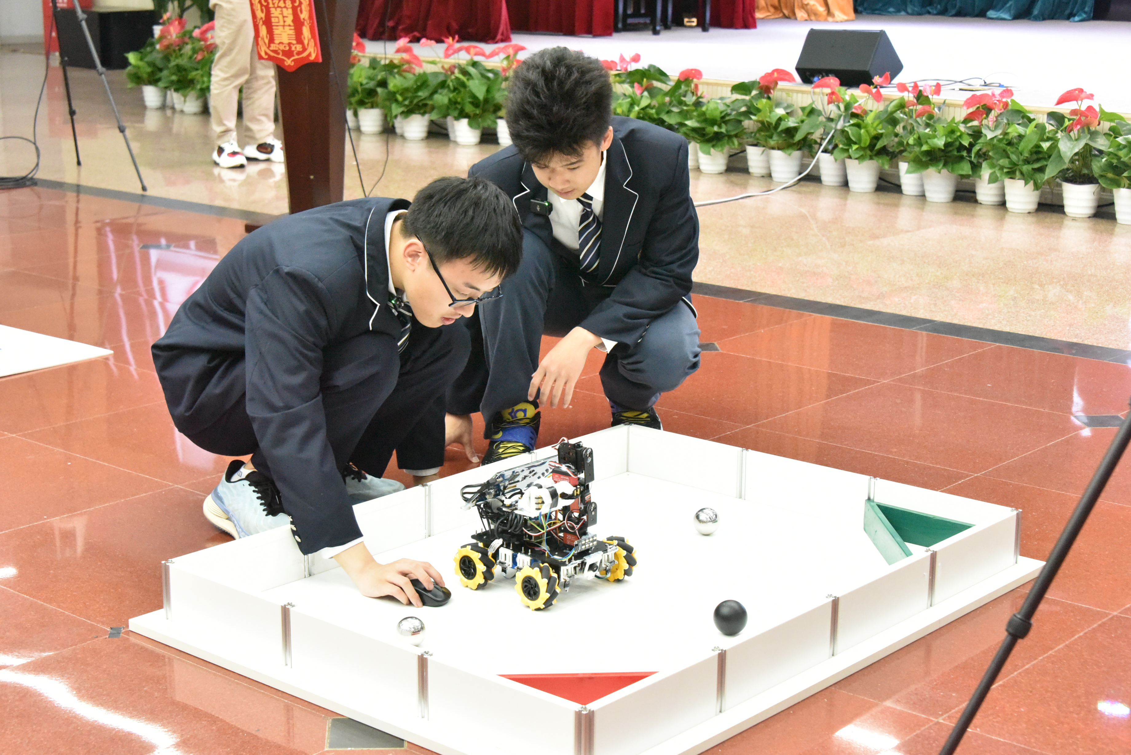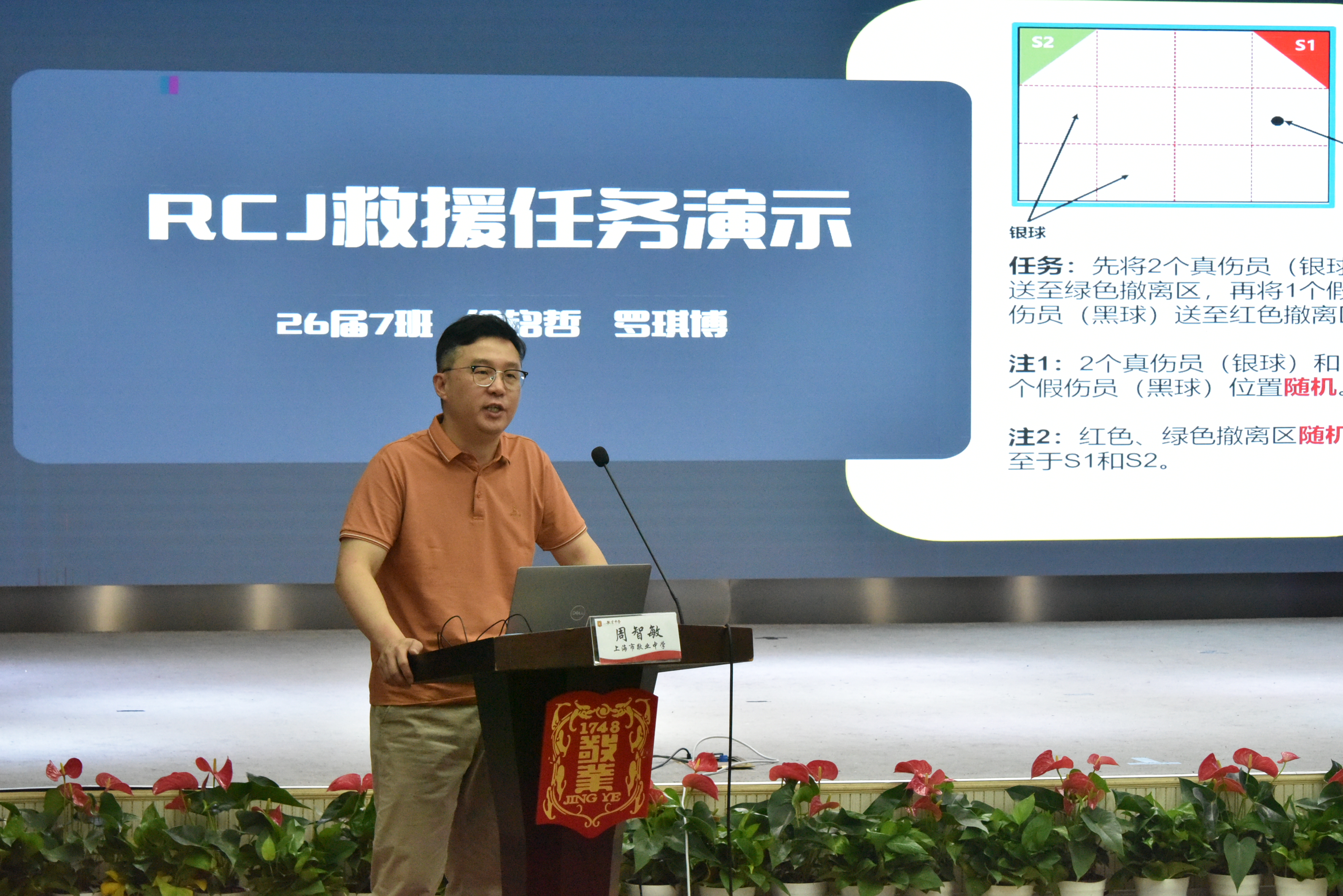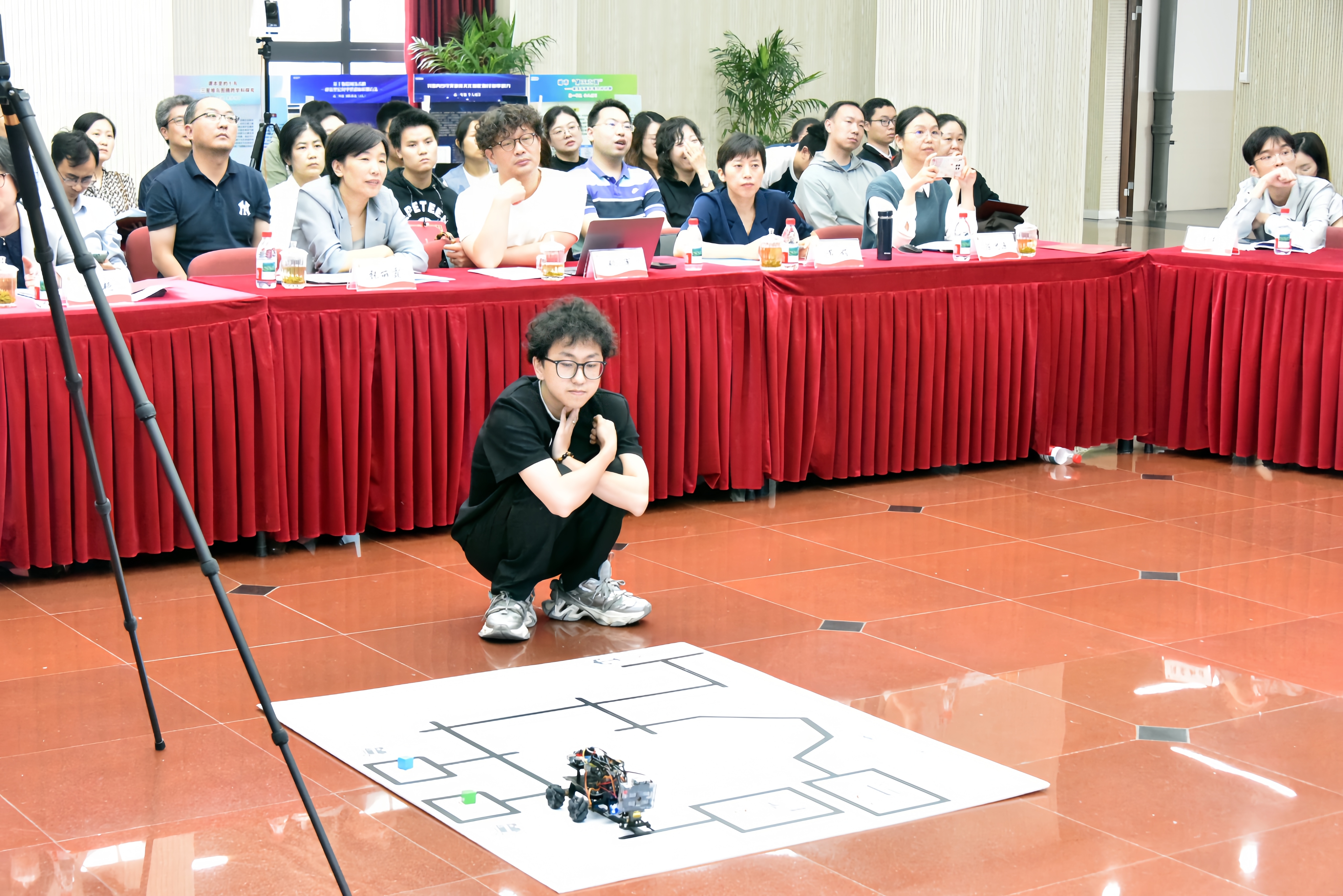 敬业中学校长张丽霞做《学校课程融创:素养培育从蓝图到实景》主题发言。她指出敬业中学始终以“敬业乐群”的精神贯穿育人理念,以工程课程为突破口,将人工智能与智能制造等前沿方向纳入课程体系,回应学生发展需求,服务国家人才战略,推动课程成为素养培育的核心载体。随后,刘博伟老师进行《指向创新素养培育的“智能制造”课程群设计与实践研究》专题分享。学校通过构建“智能制造”课程群“核心-保障-发展”三位一体支持体系,以跨域整合、逐级进阶课程体系解决学科割裂等五大冲突。其中课程体系方面,学校以基础认知、实践研究、创新应用三类课程分别面向全体学生、兴趣生、志趣生开展培养。分享中,他细致介绍通过“内培外引”提升师资保障、设立专项基金、建构评价体系等实践中的具体举措。深度剖析近年来学校在深耕课程实践、打造品牌特色上的路径,为高中阶段工程教育与创新人才培养提供可复制的实践范式。最后,周智敏分享对工程类课程《rcj智能救援机器人》的实践与思考。课程采用模拟真实救援场景的任务,采取任务驱动学习的方式,将知识分解为多个板块。课程不仅注重实践性与综合性,还强调兴趣驱动,通过动手实践让学生找到乐趣,提升工程思维与问题解决能力。周老师以课程中《机器视觉与机器学习》一课为例,结合录课视频,展示学生如何在真实环境中应用所学技术,通过实践冲突、协作突破等环节,逐步实现从知识掌握到问题解决、技术运用到方案优化的全过程学习。 会上,高二学生徐铭哲与罗琪博现场带来rcj救援机器人演示。在两人的操作下,救援机器人凭借视觉识别系统,识别场地中的“伤员”和“正常人”,逐一精准地抓取并转移至指定“救援区”和“安全区”。