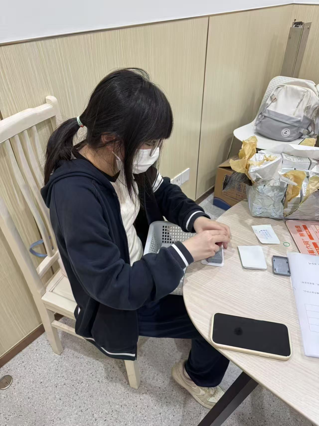 上午的任务丰富多样,最让人印象深刻之一的是参观专家门诊诊室的实践活动。推开严肃而沉重的门,门后的日程表轻轻叩击门扇,宽大的桌子上是高高的病历架和文件柜,其中不仅有各种纸质文件和文件夹,还有几本医学专用书籍和专著。桌面上放着打印机和显示器,笔筒里放着几支快用完的水笔和磨损的铅笔。消毒剂、一次性手套盒、口罩盒安静地站在一边,而儿童体重秤、身高尺、饮水机和消毒剂则规矩地沿墙摆列。这些细节展示了一位主任医师的工作场所,在体验了给患者开出的药方单上盖章的活动中,同学们也体验了作为医师扣下沉甸甸的印章时所承载的责任感。