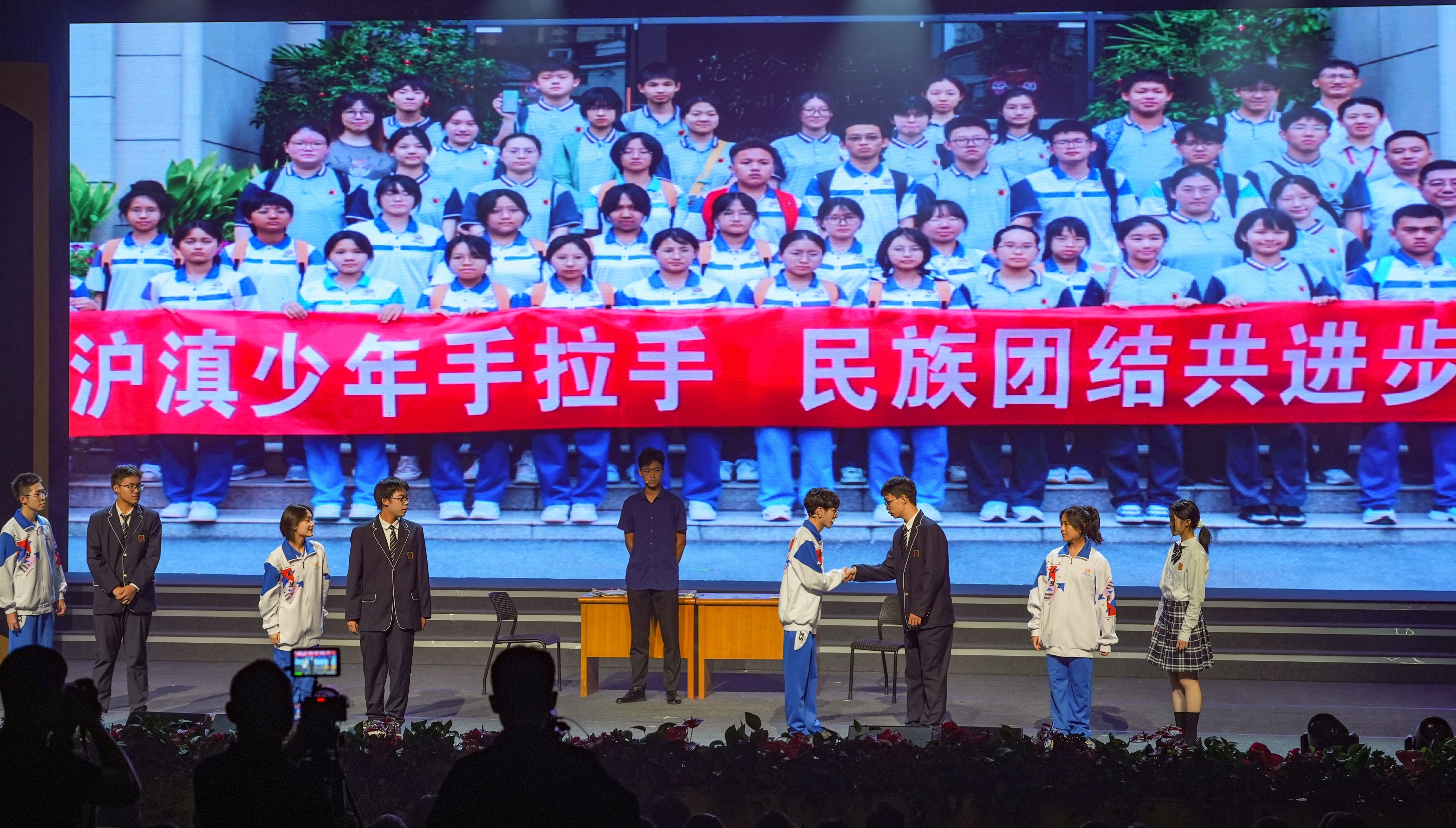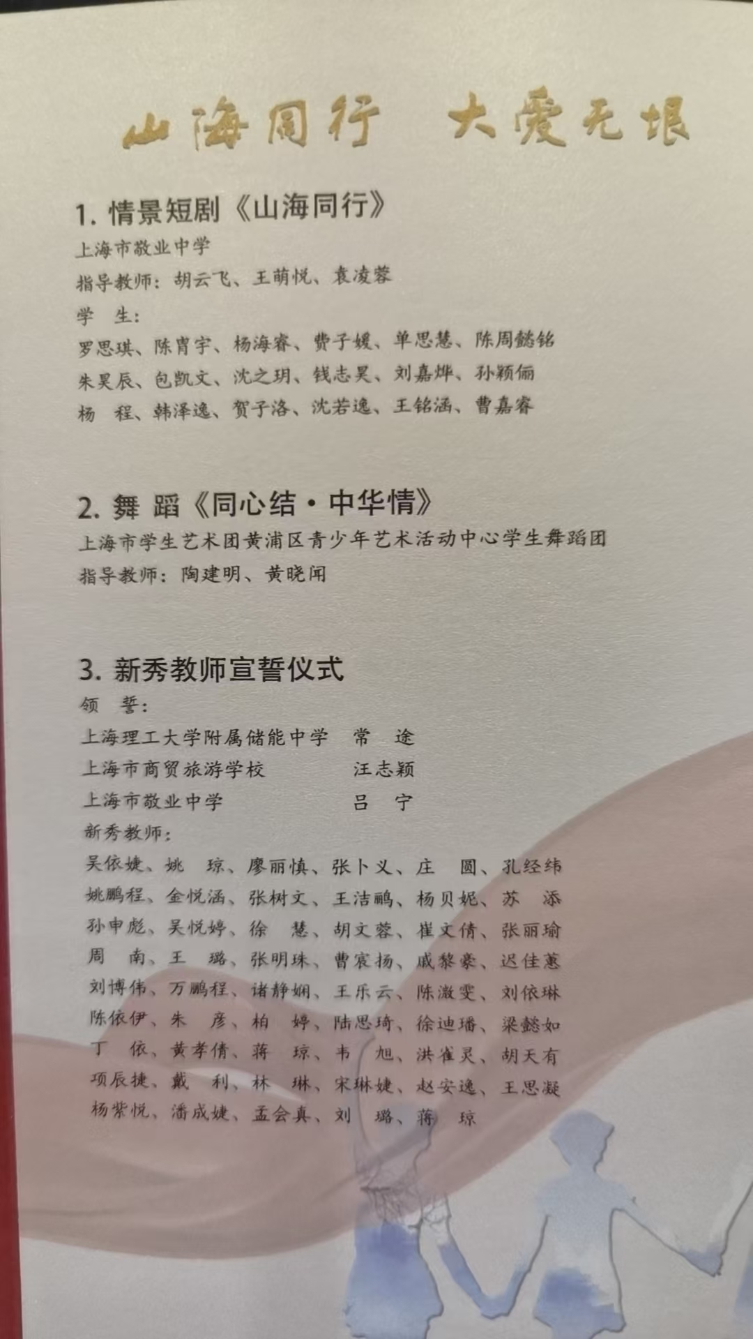 在第41个教师节到来之际,上海市敬业中学“又新”戏剧社倾情打造的原创短剧《山海同行》在上海市黄浦区庆祝第四十一个教师节大会上首演。该剧以真实援滇、援青支教故事为原型,深情致敬支教团队教师,感动了全场观众。