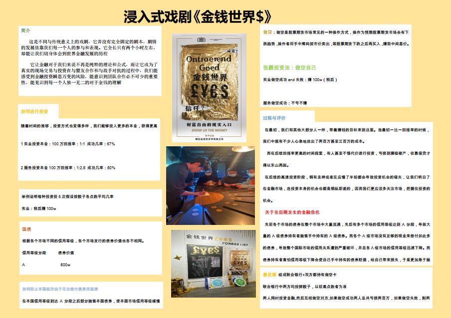第一小组的同学去往了位于博华广场的金钱世界剧场。在这部沉浸式戏剧中,他们体验了世界的经济从最开始的实体经济,到后来的数字经济,再到最终的金融投资的过程。而在戏剧的后期,同学们经历了一场金融风暴——经济危机。最终大家虽得以全身而退,但在目睹了各种重大的经济损失之后,明白了在经济体系中最重要的是人与人之间的信任,加入失去了信任,那么整个经济体系都将遭到破坏。
