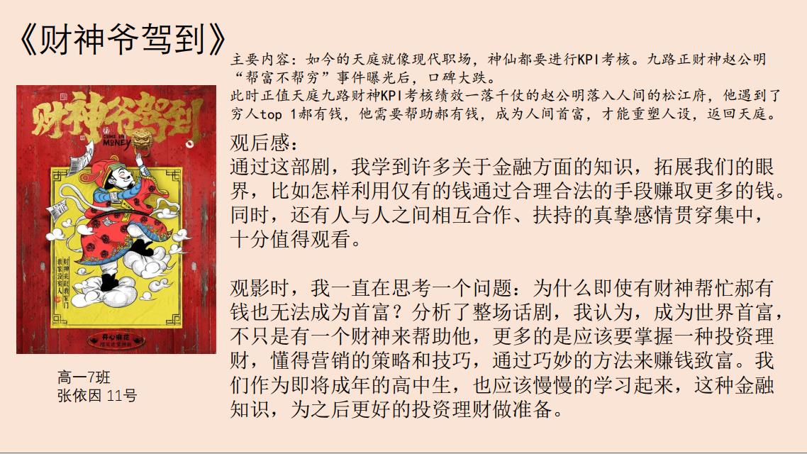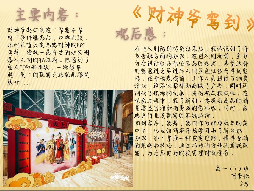 第三小组的同学走进虹桥艺术中心,观看了话剧《财神爷驾到》,内容为财神赵公明“帮富不帮穷”事件曝光后,口碑大跌,需要帮助穷人top 1郝有钱变成首富,才可返回天庭。在剧中,赵公明等人运用了地域,天气,购买人的心理,性格等制造商机。让同学们认识到了在购买商品时,不可以急躁,需要货比三家等。