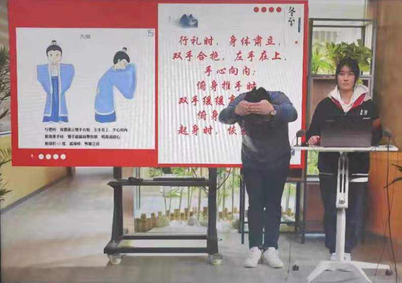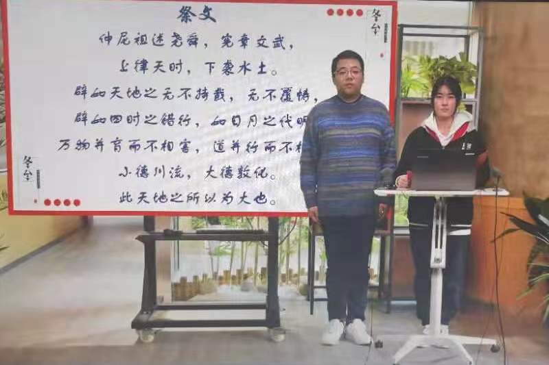 首先,杨徐嘉怡同学介绍了二十四节气——冬至的知识。冬至,又称日南至、冬节、亚岁等,被视为冬季的大节日,在古代民间有“冬至大如年”的讲法。冬至习俗因地域不同而又存在着习俗内容或细节上的差异。在中国南方地区,有冬至祭祖、宴饮的习俗。在中国北方地区,每年冬至日有吃饺子的习俗。接着,介绍了冬至祭孔的原因。我国一向有尊师传统,冬至祭孔就是一种集中表现。“冬至”曾是“年”,过了冬至日就长一岁,为了“增寿”,所以需要拜贺,举行祭孔典礼。然后,大家一起欣赏了由高二五班的同学们配音制作的文庙导览视频。