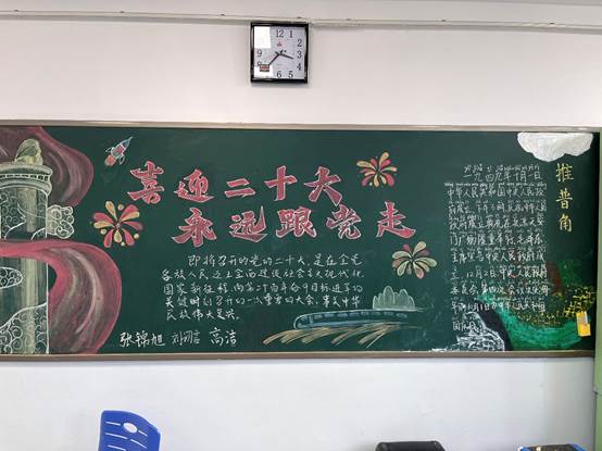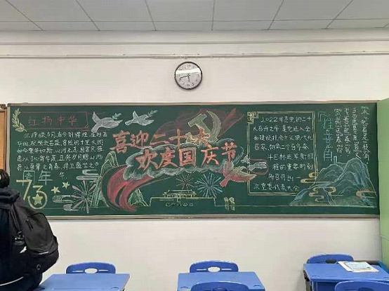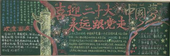一年好景君须记,最是橙黄橘绿时。为庆祝新中国成立73周年,迎接党的二十大顺利召开,培养学生的爱党爱国热情,弘扬中华优秀传统文化,丰富校园文化学习氛围,提高学生人文素养和爱国热情,我校于近日开展了“喜迎二十大 欢度国庆节”黑板报评比活动。从板报的整体设计到每个板块的布局,同学们进行了精心的构思。浑圆挺拔的华表,纯洁美好的和平鸽……各班设计出了主题鲜明、内容充实的黑板报作品。他们用粉笔勾画出对祖国的热爱,用文字书写出对祖国的美好祝福。
