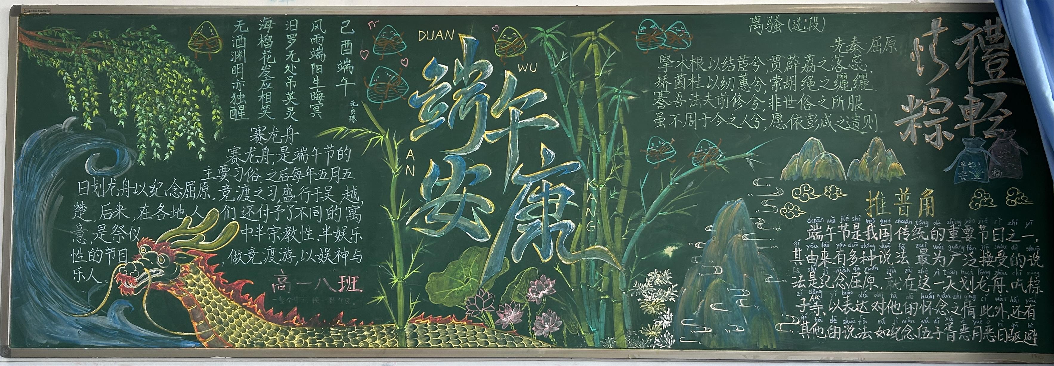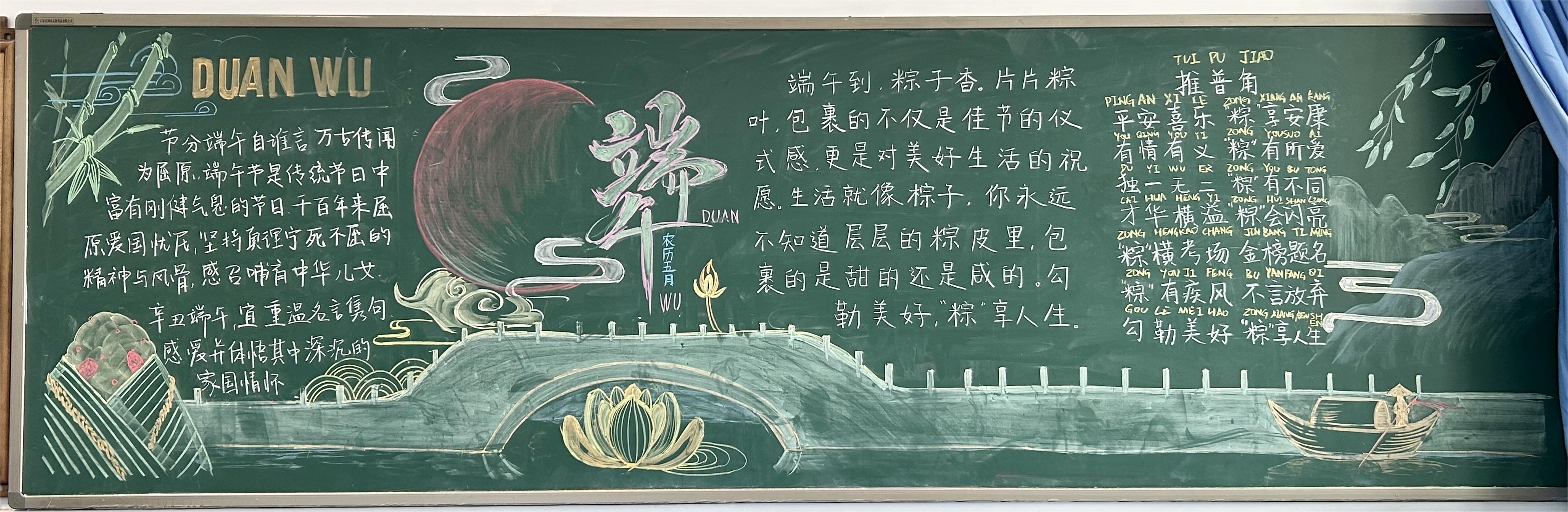 为让学生深入的了解我国的传统节日——端午节,加强学生的中华优秀传统文化教育,所以本月以“端午”为主题。这一份份板报汇聚了学生们的心血,是他们用自己手中的画笔或写或画地记录下自己所了解的端午风俗和优秀的传统文化内容。经过学校评选,本期黑板报获奖名单如下: