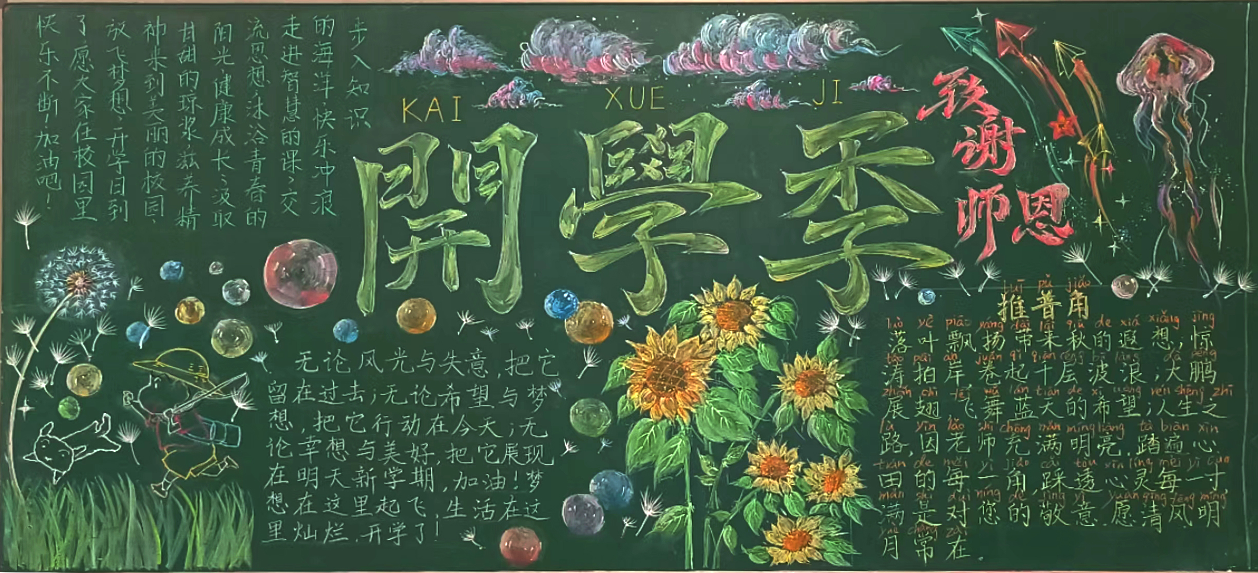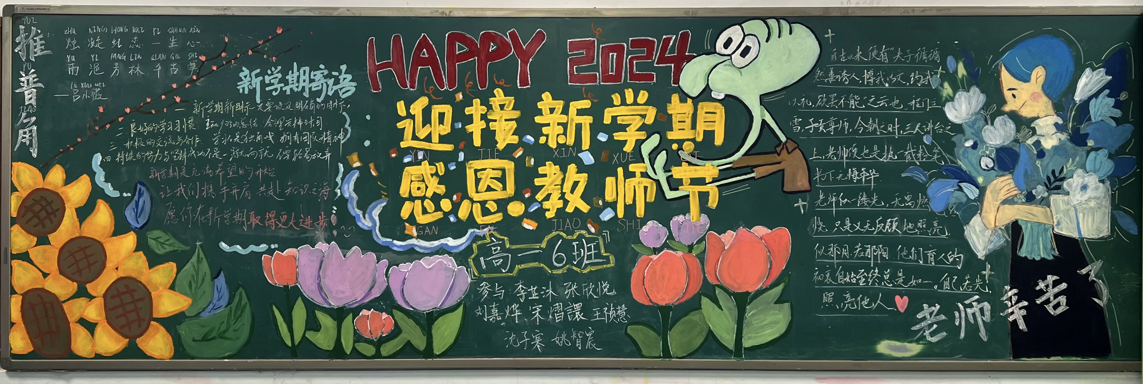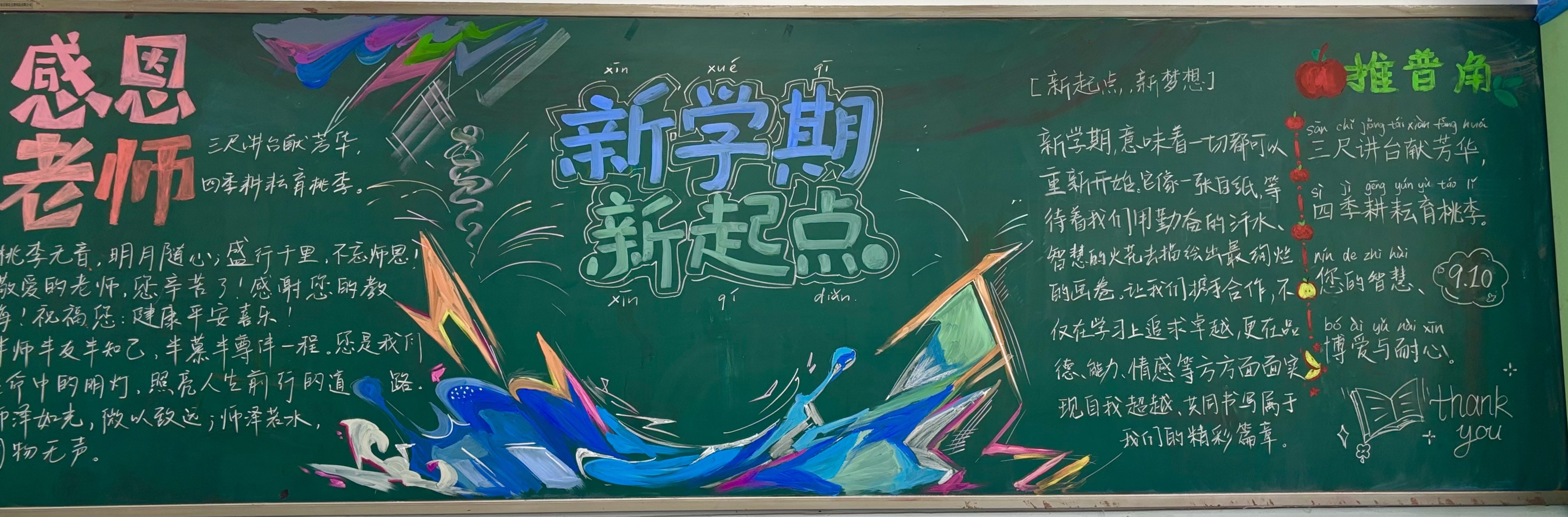 行而不辍,未来可期。在新学期启航之际,我校学子展望新征程,以画笔与文字记录对未来的期许,为梦想激荡澎湃斗志。正值第40个教师节到来,桃李芬芳,教泽绵长,同学们亦感念师恩,写下对于老师们的感恩心意。我们期待携手共进,写下新的灿烂篇章。经过学校评选,本期黑板报获奖名单如下: