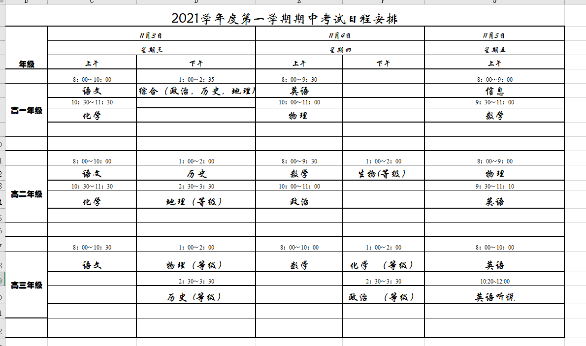 2021学年度第一期期中考试安排