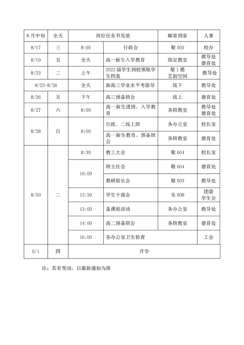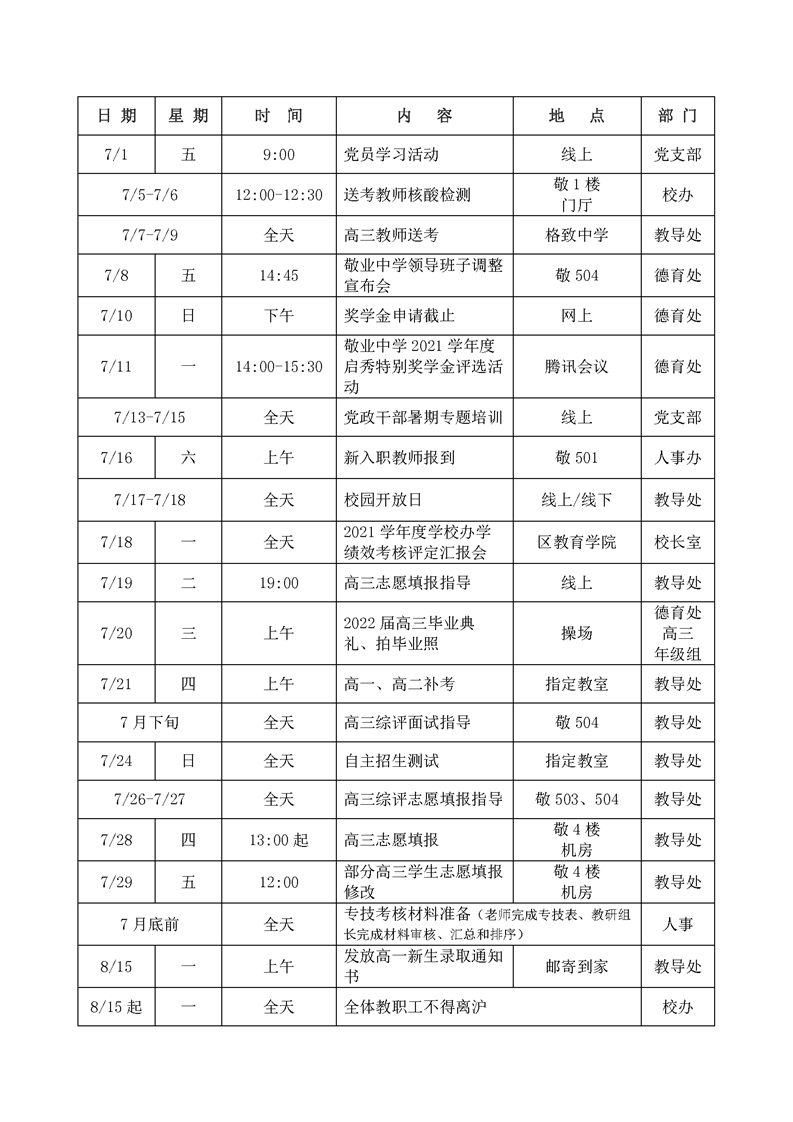 2021学年度第二学期暑期及新学期开学初主要工作日程安排