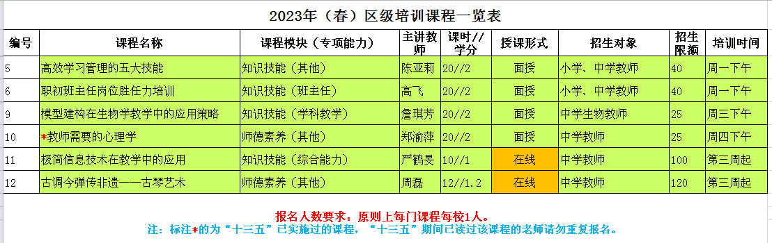 2023(春)区级教师培训课程已确定,高中学段的课程如下。由于名额有限,请有意向报名课程的老师于12月15日下午15点前微信/电话联系邵然老师报名。