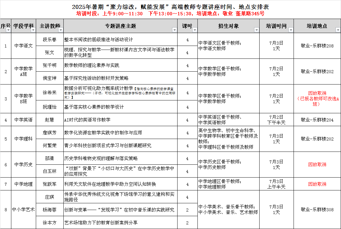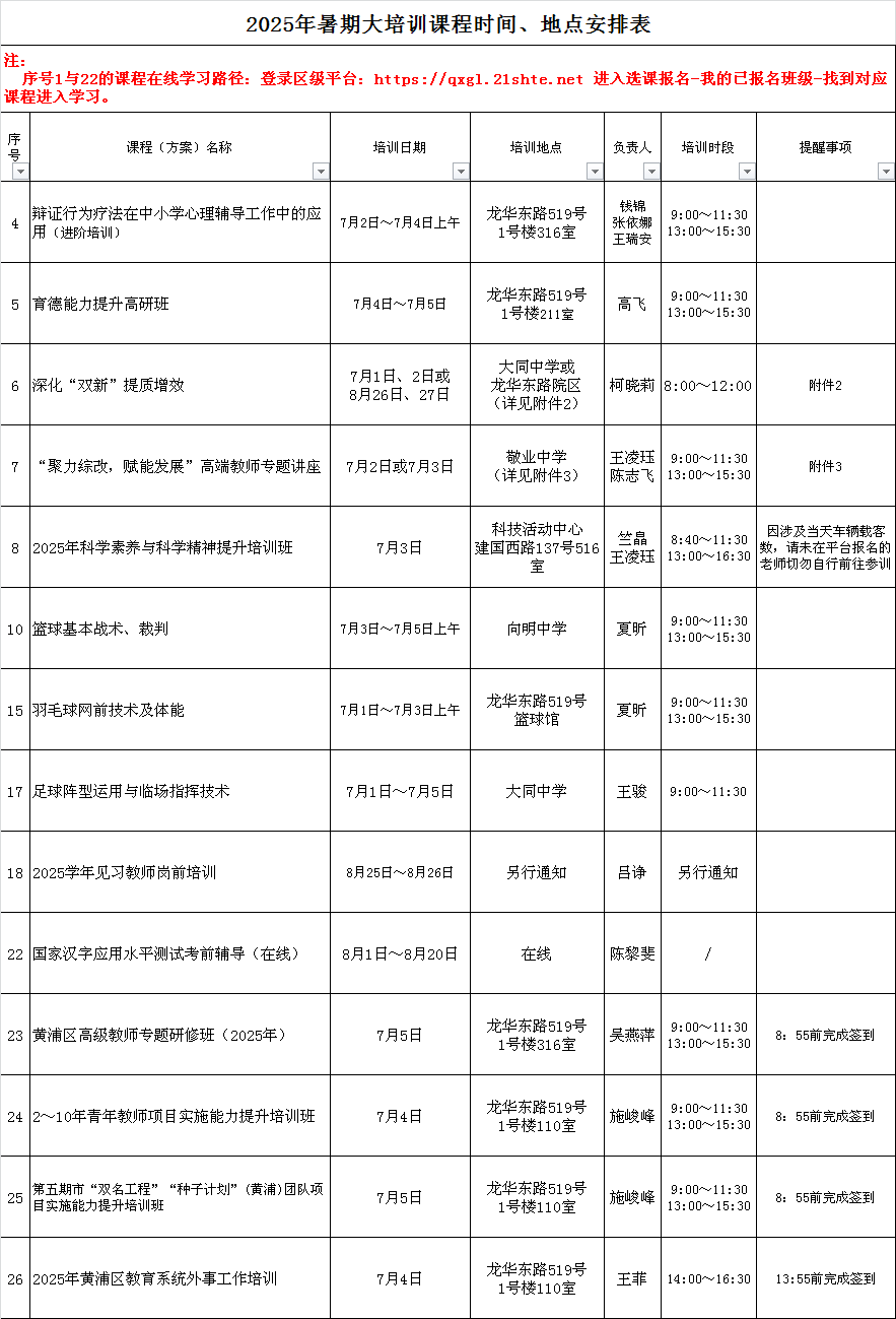本次培训各门课程的培训时段、地点不一,请相关教师按附件中课程安排表中的培训时间、地点准时参训。