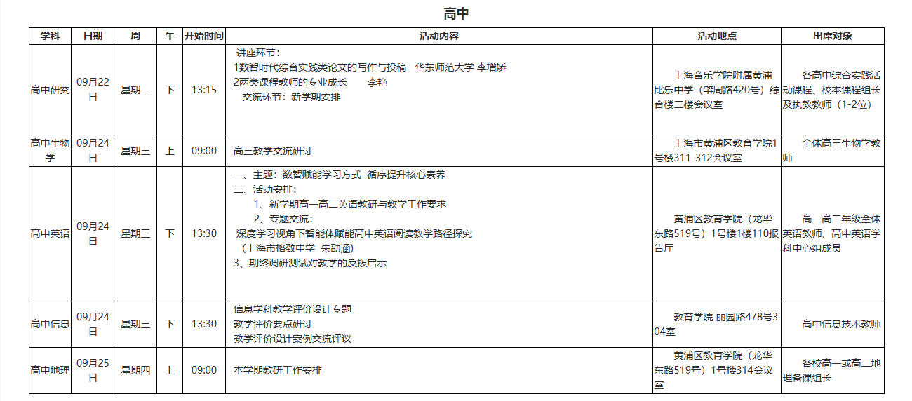 2025-09-15~2025-09-20中学教研活动安排