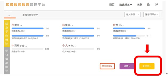 (2)登录黄浦区教师教育管理平台https://qxgl.21shte.net/portal/login.html——未评价——完成所有区级、校级课程评价。(见下图)